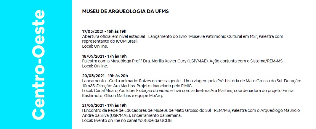 O Muarq também vai participar da 19ª Semana Nacional dos Museus, que será realizada entre 17 e 23 de maio. Na programação, constam o lançamento do livro Museu e Patrimônio Cultural em MS, palestras e exibição da animação Raízes da Nossa gente. Além do Muarq, a Casa da Ciência e Cultura da UFMS programou atividades como exibição de filmes e visita guiada à exposição Tocando os Astros.