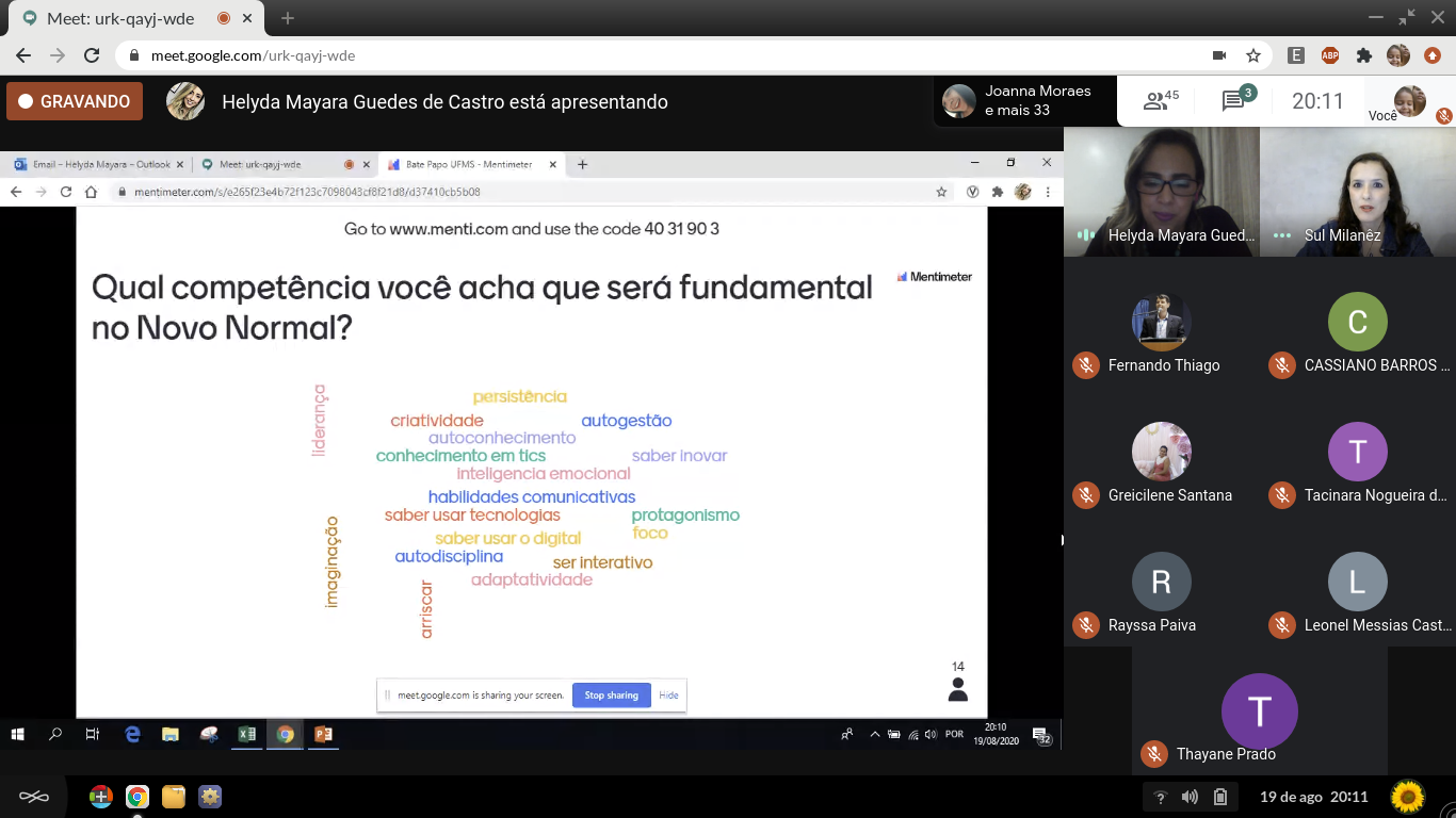 Como respostas dos participantes para a pergunta de abertura surgiram os seguintes conceitos: persistência, criatividade, autoconhecimento, protagonismo, inteligência emocional, etc. E com isso, as professoras destacaram dez competências que podem ajudar nesse Novo normal.