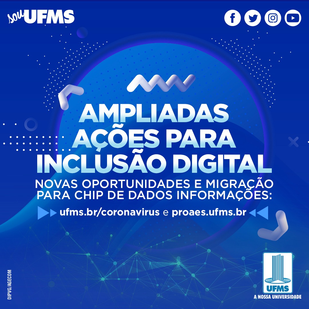Foram publicados novos editais ampliando o atendimento da UFMS à inclusão digital dos estudantes. Ao todo são 3.000 novas oportunidades para graduandos e pós-graduandos e a substituição do Auxílio de Inclusão Digital pelo chip de dados, concedido por meio do programa “Alunos conectados” da Rede Nacional de Ensino e Pesquisa (RNP) e Ministério da Educação (Mec).