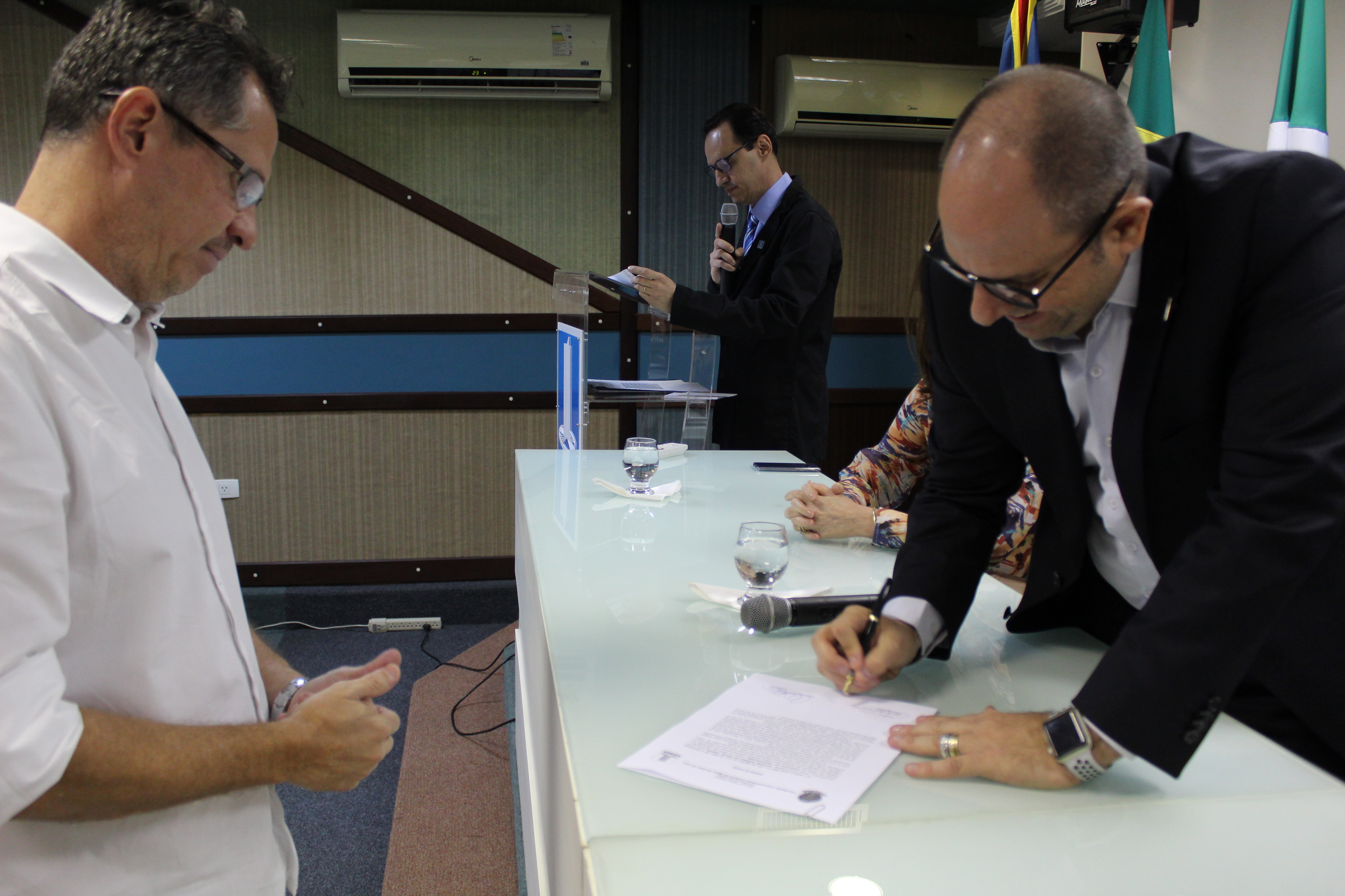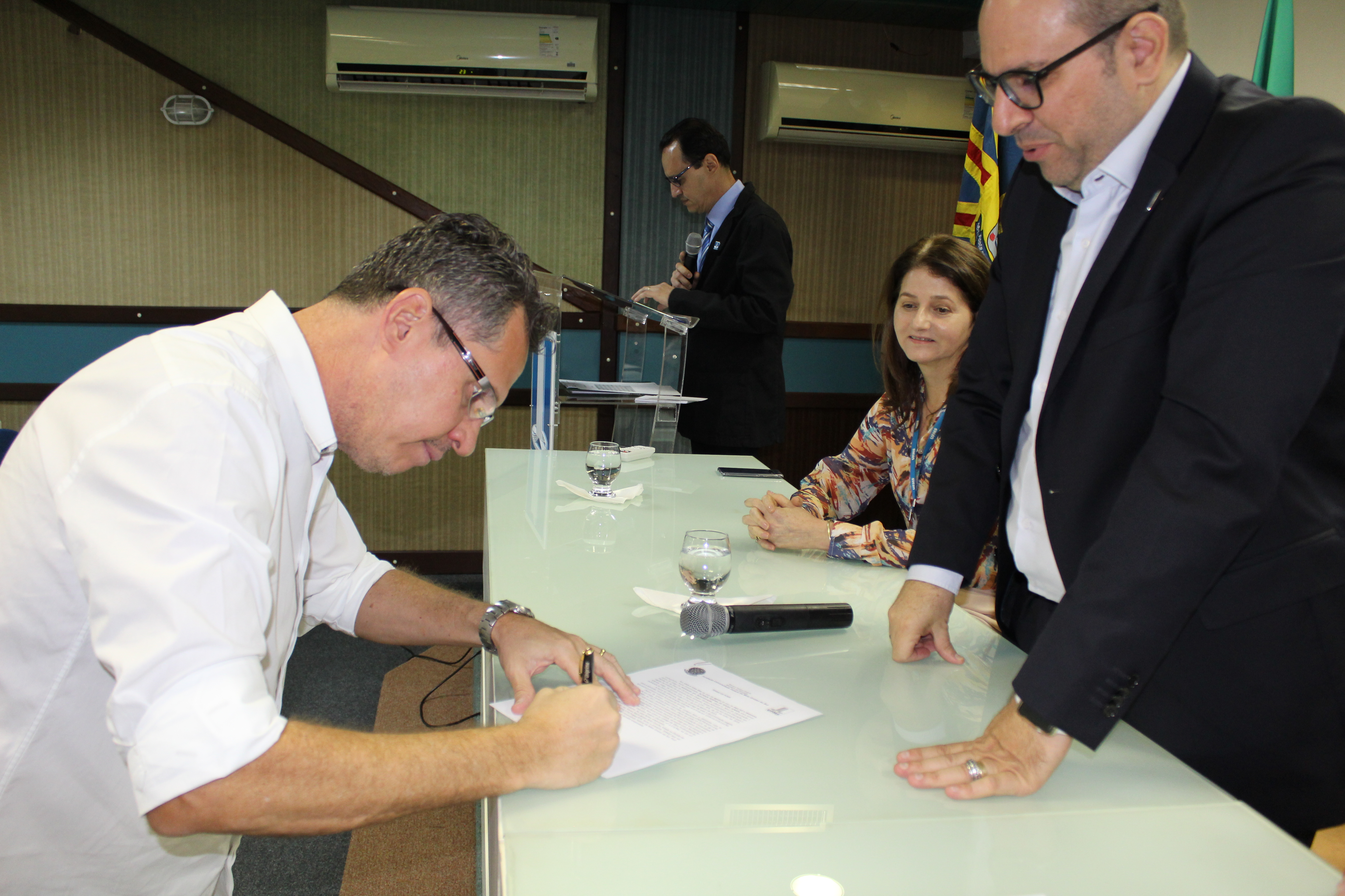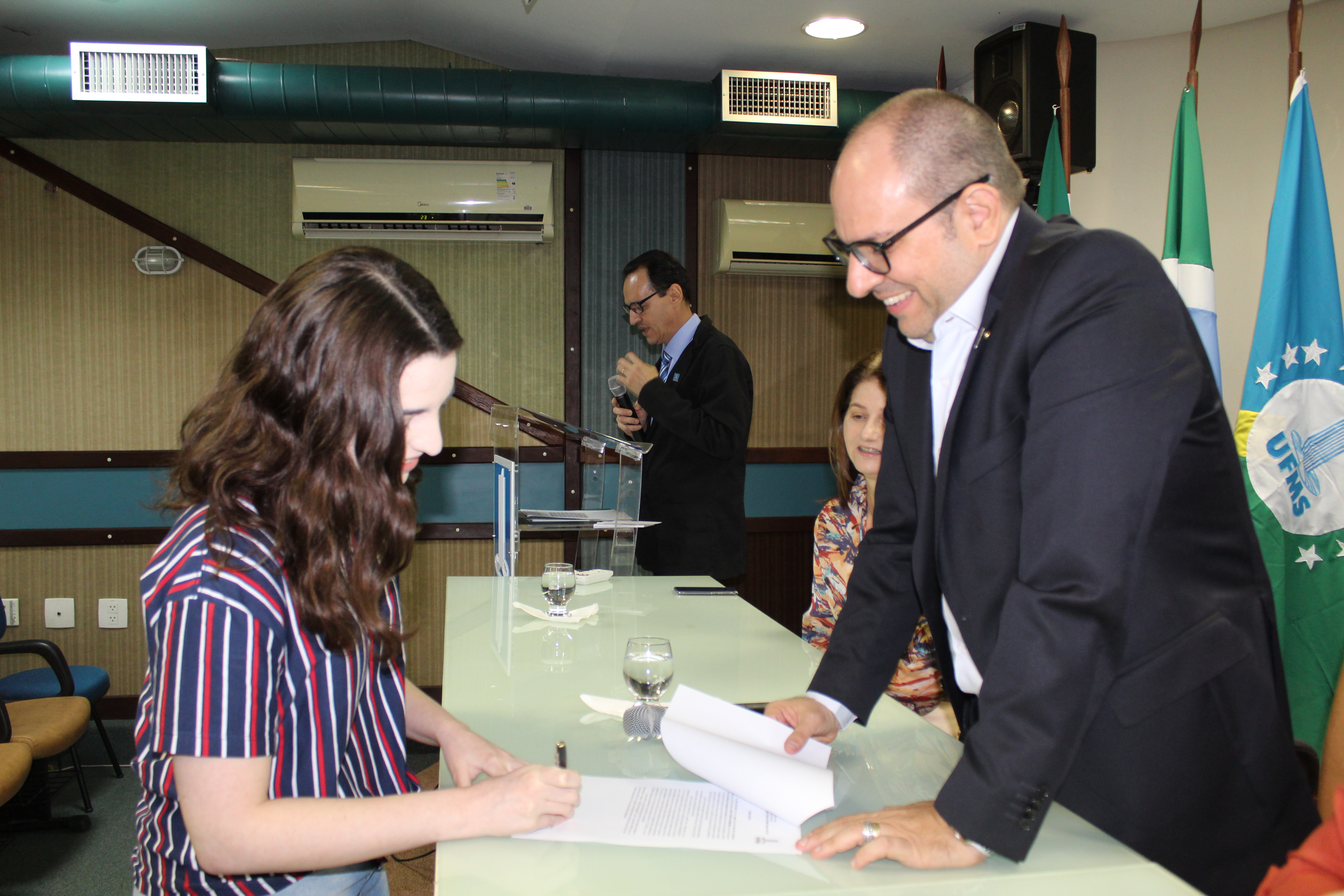 Nesta quinta-feira (29), o reitor Marcelo Turine deu posse a sete novos servidores, sendo dois no cargo de técnico administrativo (classe D), Altidor Pereira de Sousa Junior e Maik Oliveira Silva; quatro no cargo de técnico administrativo (classe E), Fernando Delapria, Cristiane Bruno Cabral, Bruna Diniz Rios e Ingrid Ferreira Curimbaba, e uma no cargo de professor adjunto A, Dulceli de Lourdes Tonet Estacheski. Participaram da cerimônia, na Sala de Atos da Reitoria, as pró-reitoras Ana Rita Barbieri (Proaes), Dulce Tristão (Proplan) e Gislene Walter da Silva (Progep, em exercício), além de técnicos, amigos e familiares.