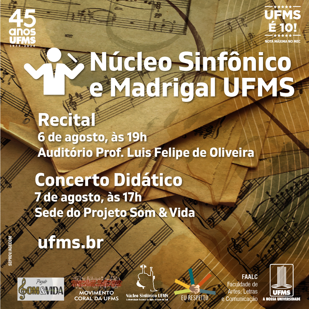 A música será a protagonista dos eventos que marcam o início de um novo semestre na Universidade. O Núcleo Sinfônico e o Grupo Madrigal UFMS realizam apresentações abertas ao público e com entrada gratuita.
