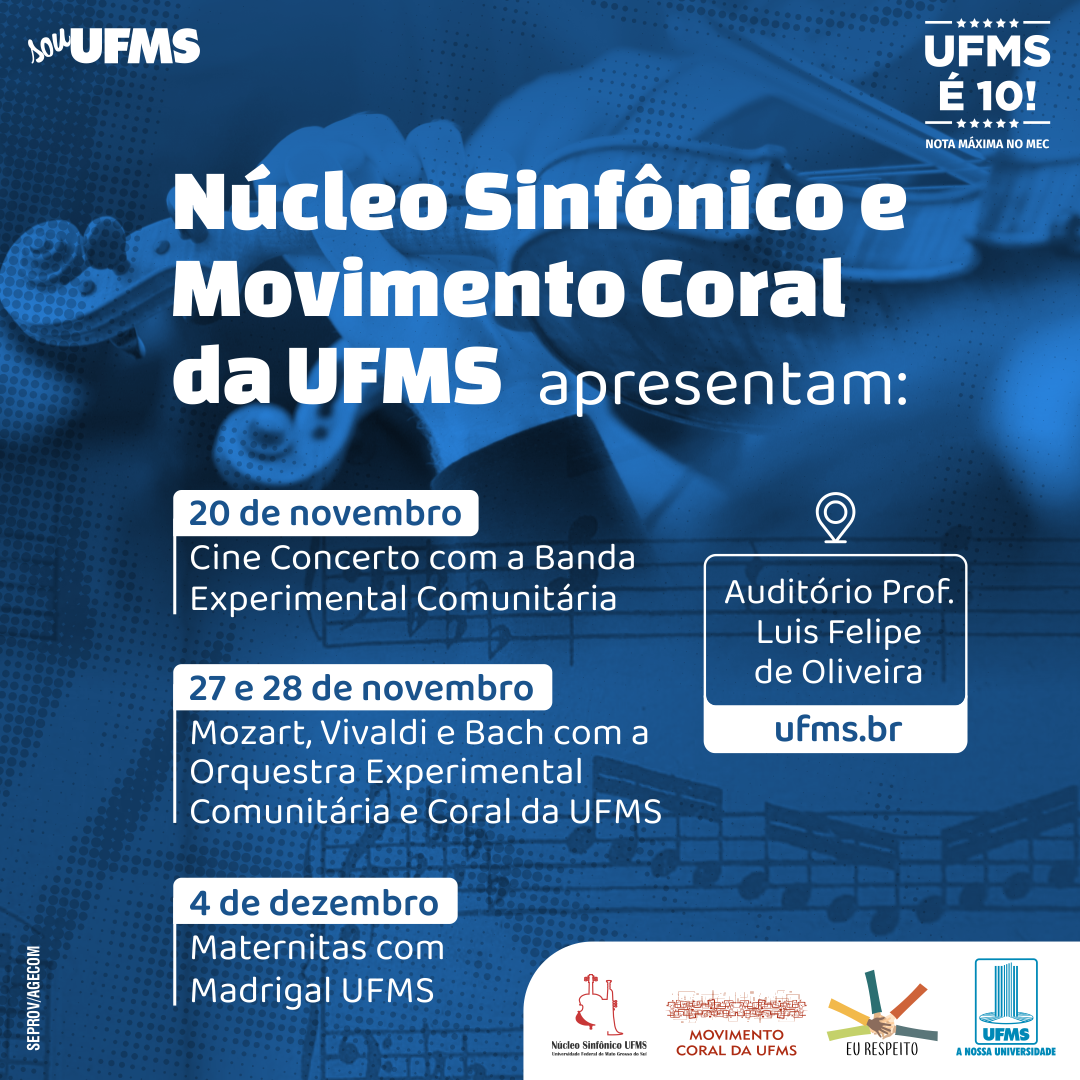 Nos meses de novembro e dezembro, três conjuntos musicais mantidos pelo Núcleo Sinfônico UFMS realizam concertos abertos à comunidade na Cidade Universitária. As apresentações ocorrem a partir das 20h30, no Auditório Professor Luís Felipe de Oliveira, do Curso de Música, localizado no Bloco 23.