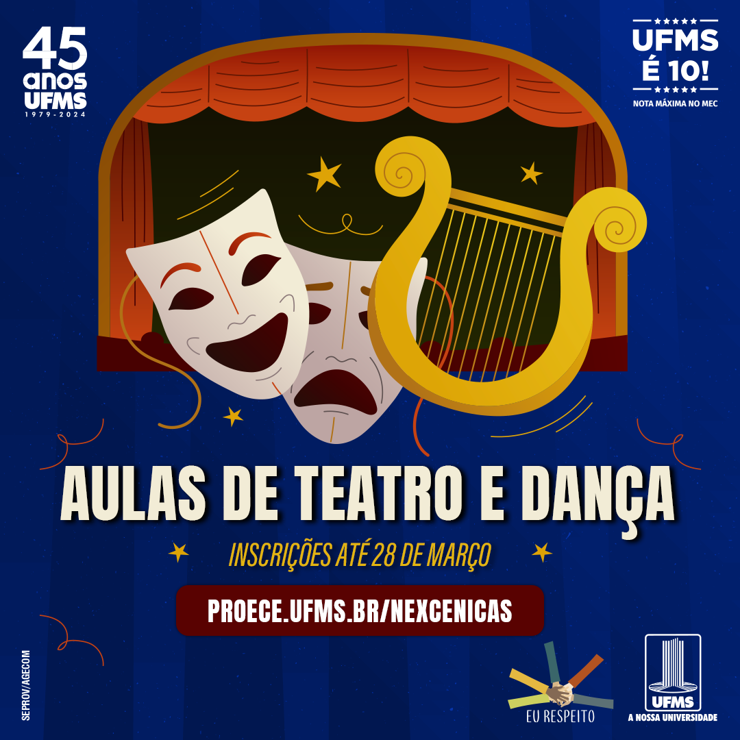Até 28 de março, estão abertas as inscrições para participar das aulas oferecidas pelos núcleos de Extensão em Artes Cênicas (NEX) e de Estudos em Dança e Movimento (Nedem) da UFMS. Para participar é necessário apenas ter idade a partir de 18 anos. Podem participar estudantes e servidores, além da comunidade externa.