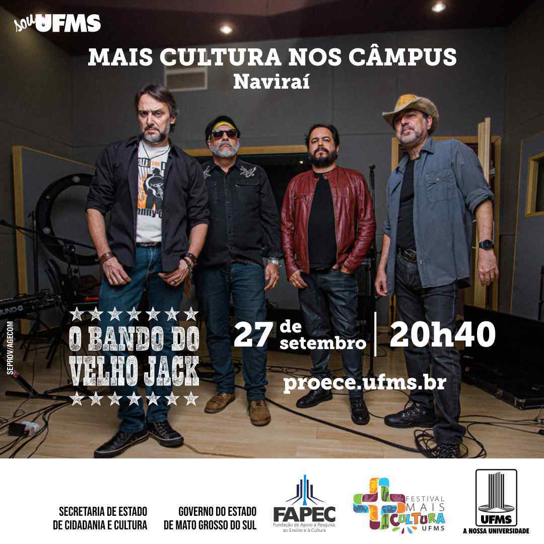 Nesta terça-feira, 27, a banda O Bando do Velho Jack se apresenta no corredor central do Câmpus de Naviraí, a partir das 20h40min. A apresentação é promovida pelo programa Mais Cultura.