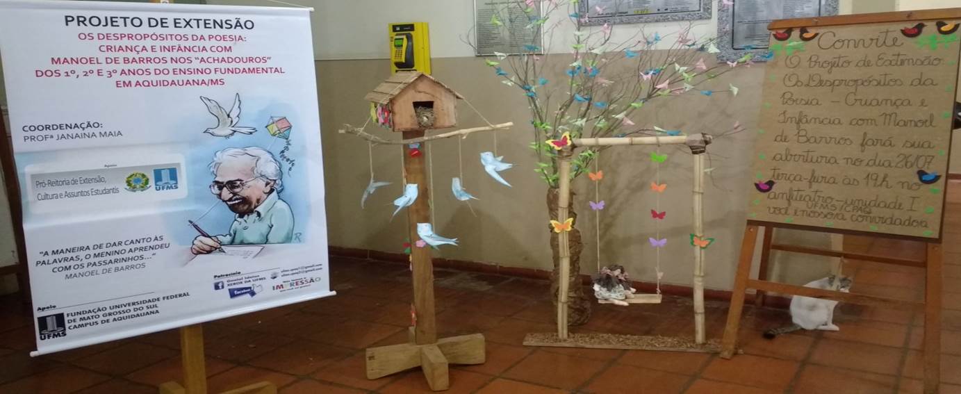O projeto de extensão “Os despropósitos da poesia: criança e infância com Manoel de Barros” tem levado a crianças da rede pública municipal de Aquidauana atividades diferenciadas para seu desenvolvimento. Alguns dos objetivos são: proporcionar a elas uma infância saudável e imaginativa por meio da literatura; propiciar a alfabetização baseada em uma formação literária, cultural e artística; garantir o acesso gratuito à cultura literária sul mato grossense, baseados nas obras de Manoel de Barros; oportunizar atividades práticas que integram as diversas áreas do conhecimento para fortalecer e ilustrar a correlação entre arte, cultura, e as outras formas do saber; e oferecer uma formação multidisciplinar, onde a interação entre duas ou mais disciplinas tem como meta superar a fragmentação do conhecimento.