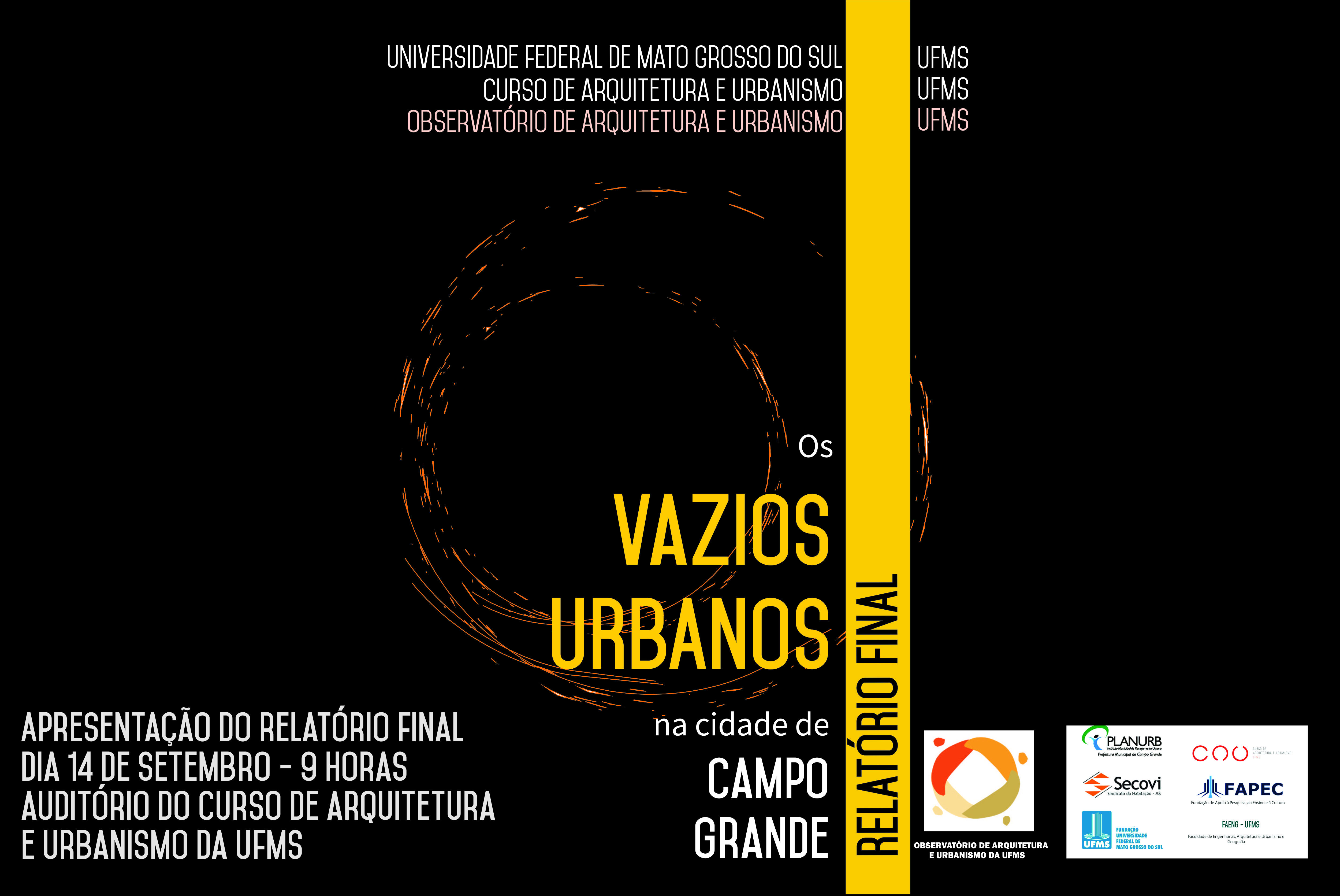 Será apresentado no dia 14 de setembro o relatório final do Observatório de Arquitetura e Urbanismo da UFMS sobre os Vazios Urbanos de Campo Grande. O evento será no auditório do curso de Arquitetura e Urbanismo a partir das 9h.