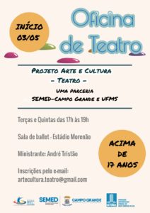 Em parceria com a Secretaria Municipal de Educação (SEMED) a UFMS oferece, a partir do dia 3 de maio, aulas de Oficina de Teatro, do Projeto Arte e Cultura.