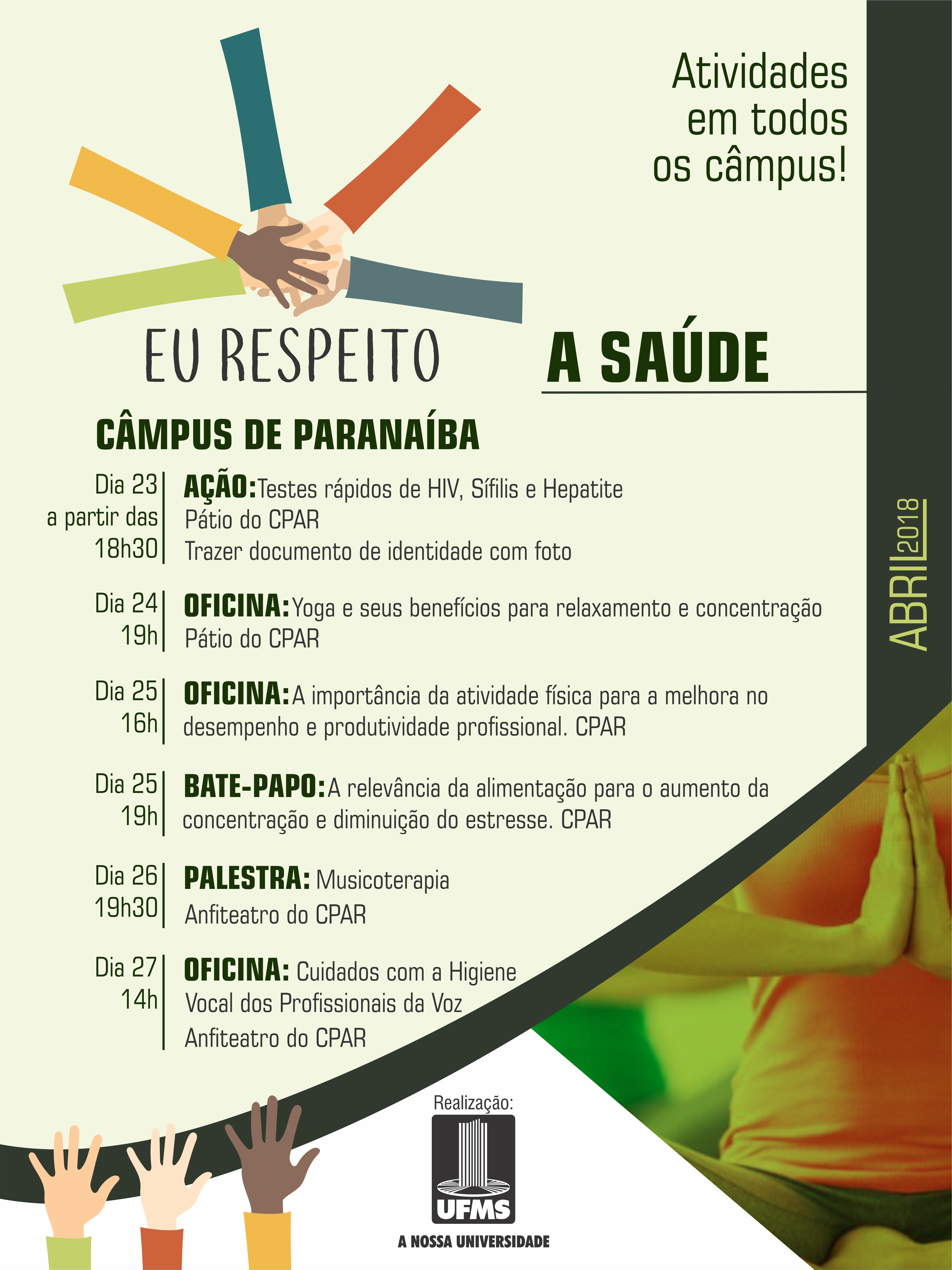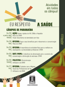 O Câmpus de Paranaíba (CPAR) realiza na próxima semana ações diárias relacionadas à campanha “Eu Respeito”. As atividades acontecerão no pátio e no anfiteatro do câmpus e o objetivo é integrar a comunidade acadêmica promovendo a saúde e o respeito.