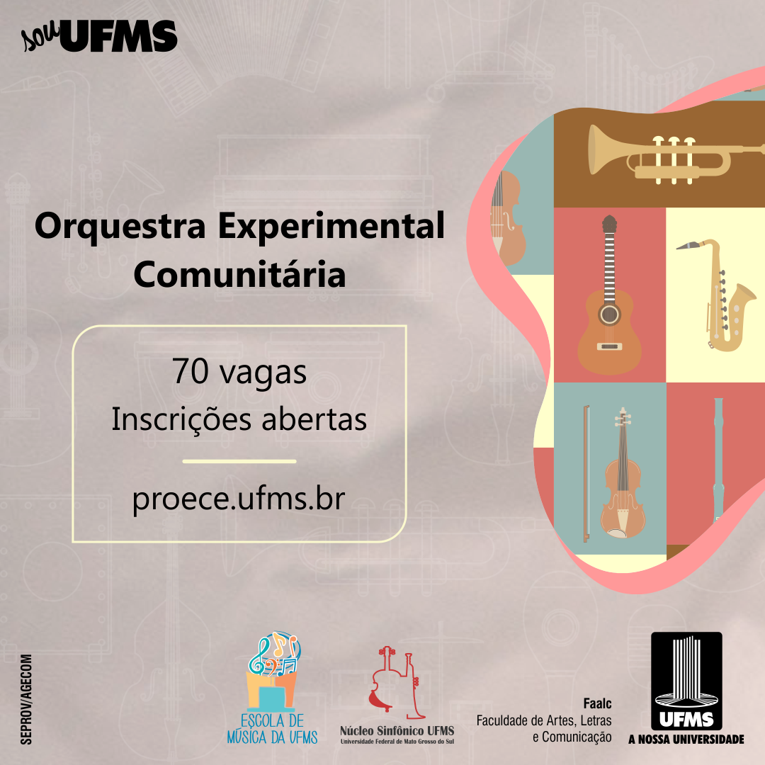 Estão abertas as inscrições para participar das atividades da Orquestra Experimental Comunitária da UFMS. Ao todo, foram ofertadas 70 vagas para os interessados que possuam um instrumento e conhecimento básico sobre música. Não há taxas de matrícula ou mensalidade e podem participar pessoas da comunidade interna e externa.
