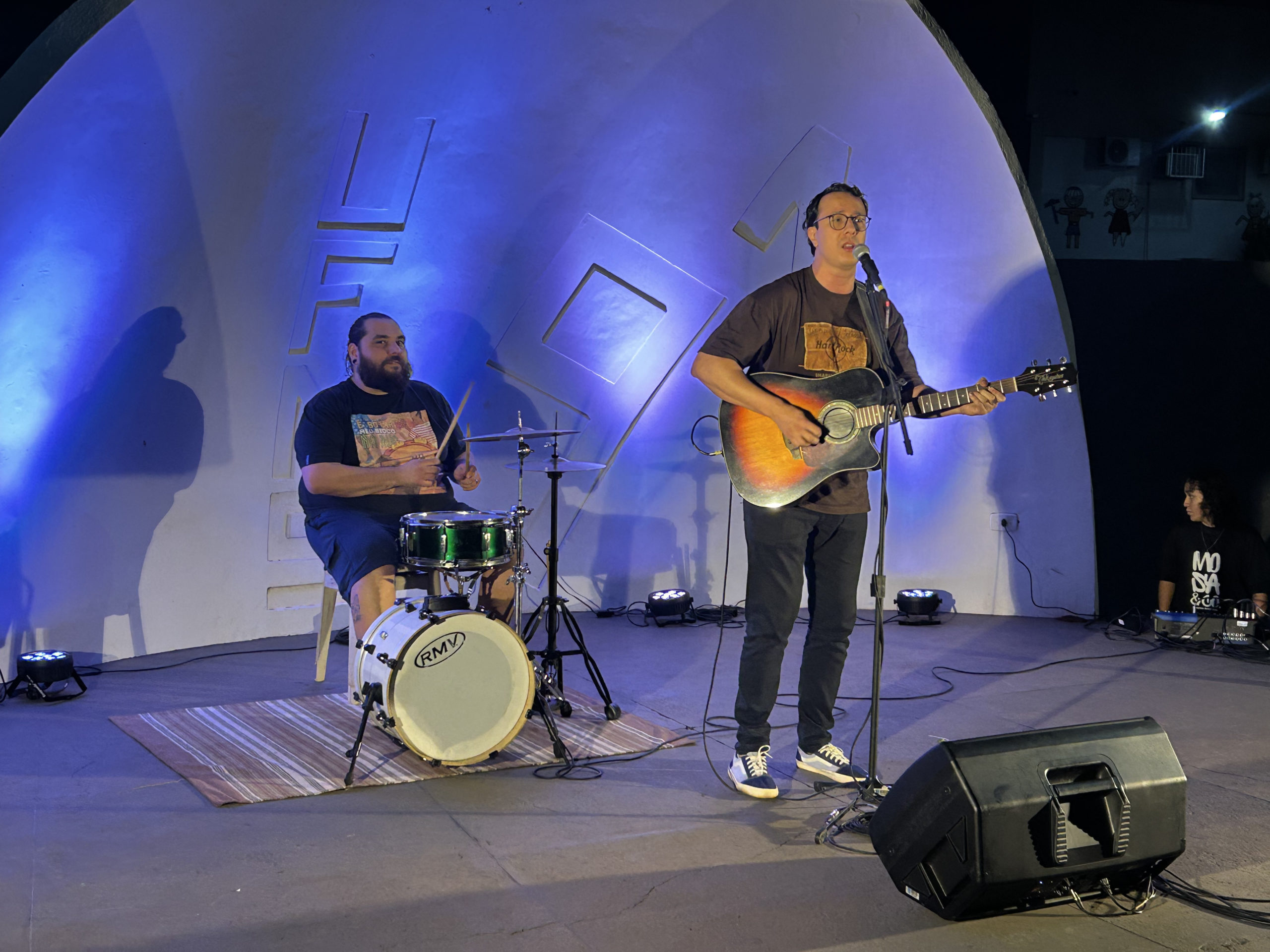 O som dedilhado tocado no violão do estudante de Sistemas de Informação da Faculdade de Computação Kaê Budke também marcou presença no palco aberto, fazendo par com a voz do estudante de Psicologia da Faculdade de Ciências Humanas Dudi Lima, o Dudi Fruity. Juntos, os dois evocaram o pop internacional. “Eu sempre uso o violão para extravasar o que eu estou sentindo, expressar o que eu não consigo falar. Mesmo eu sendo muito tímido para tocar, me apresentar em público e tal, essa experiência foi bem interessante. Quem sabe, já nos próximos eventos que tiver, eu possa ficar cada vez mais confortável de subir ao palco”, disse Kaê.