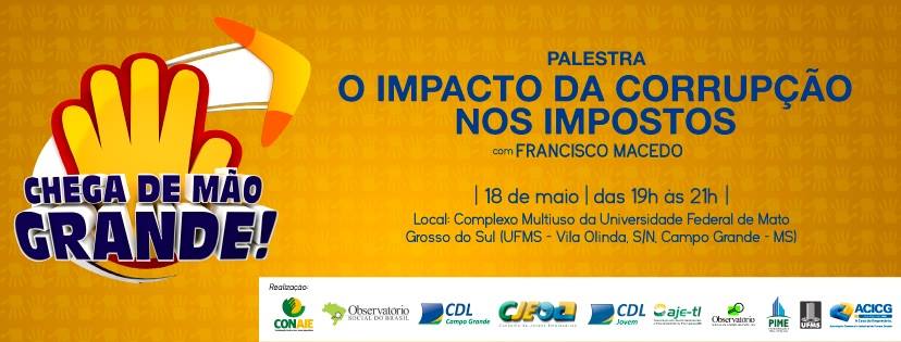 No dia 18/5, no complexo multiuso da Universidade Federal de Mato Grosso do Sul (UFMS), será realizada a palestra “O Impacto da Corrupção nos Impostos”, proferida por Francisco Demontiê Gonçalves Macedo, voluntário na Associação Brasileira da Cidadania e do Consumidor de Mato Grosso do Sul (ABCCON-MS).