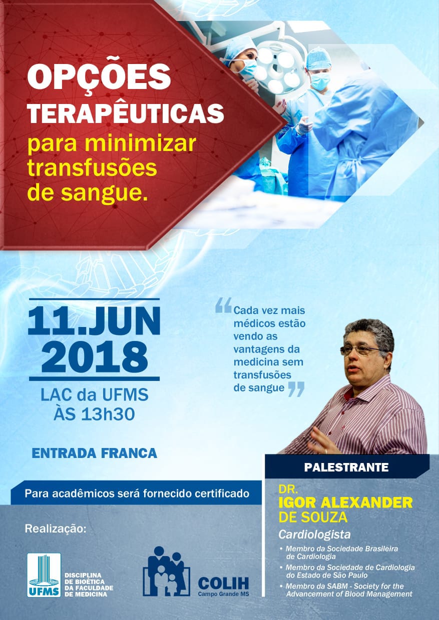 A partir das 13h30 de hoje (11) será realizada no Anfiteatro do Laboratório de Análises Clínicas da UFMS (LAC) a palestra “Opções terapêuticas para minimizar transfusões de sangue”. A participação é gratuita e aberta a toda a comunidade, para os acadêmicos será oferecido certificado de atividades.