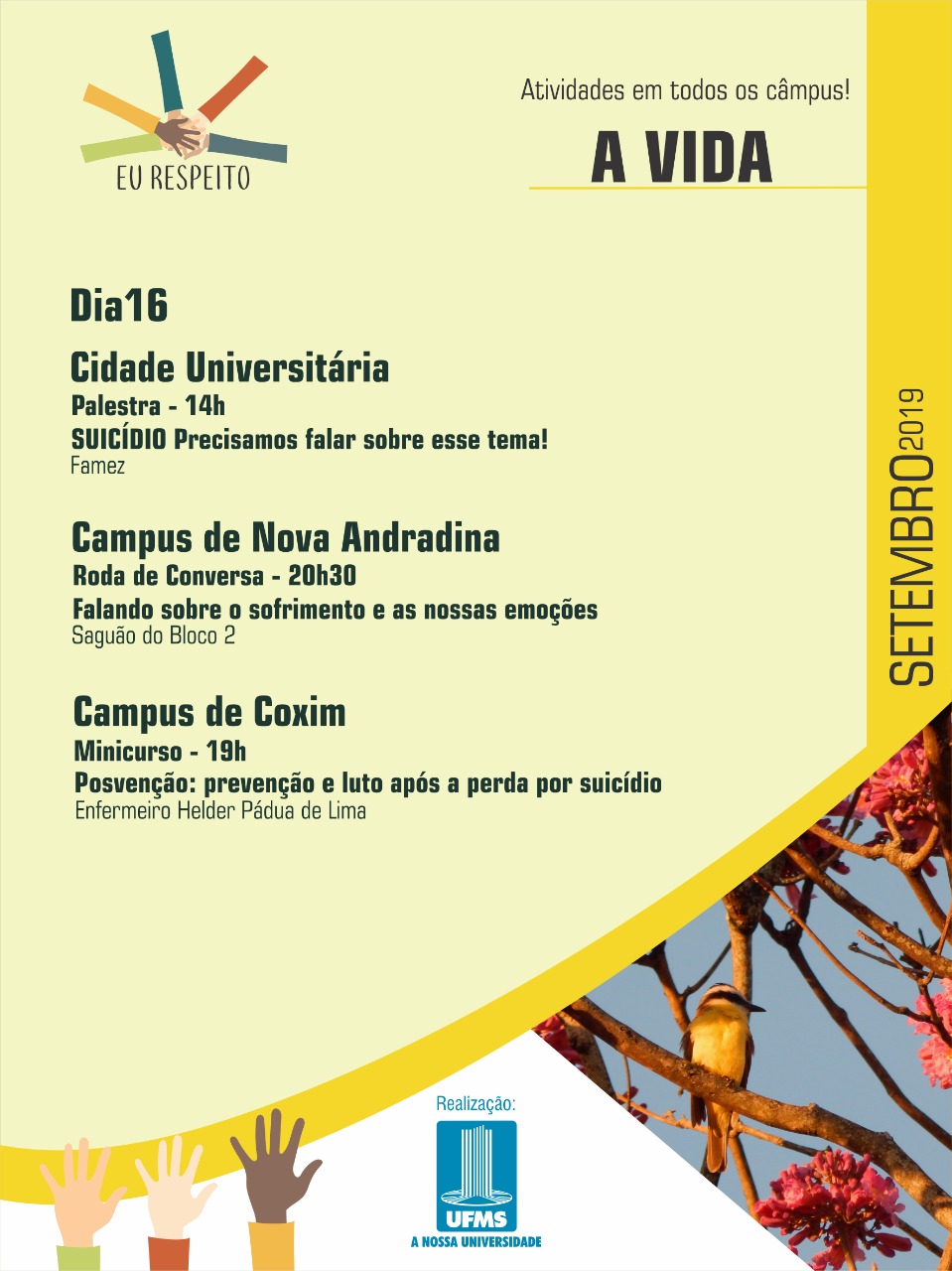 Em setembro a UFMS contribui com o Setembro Amarelo em sua campanha institucional Eu Respeito, que possui uma gama de atividades programadas ao longo de todo o mês com o tema a vida.