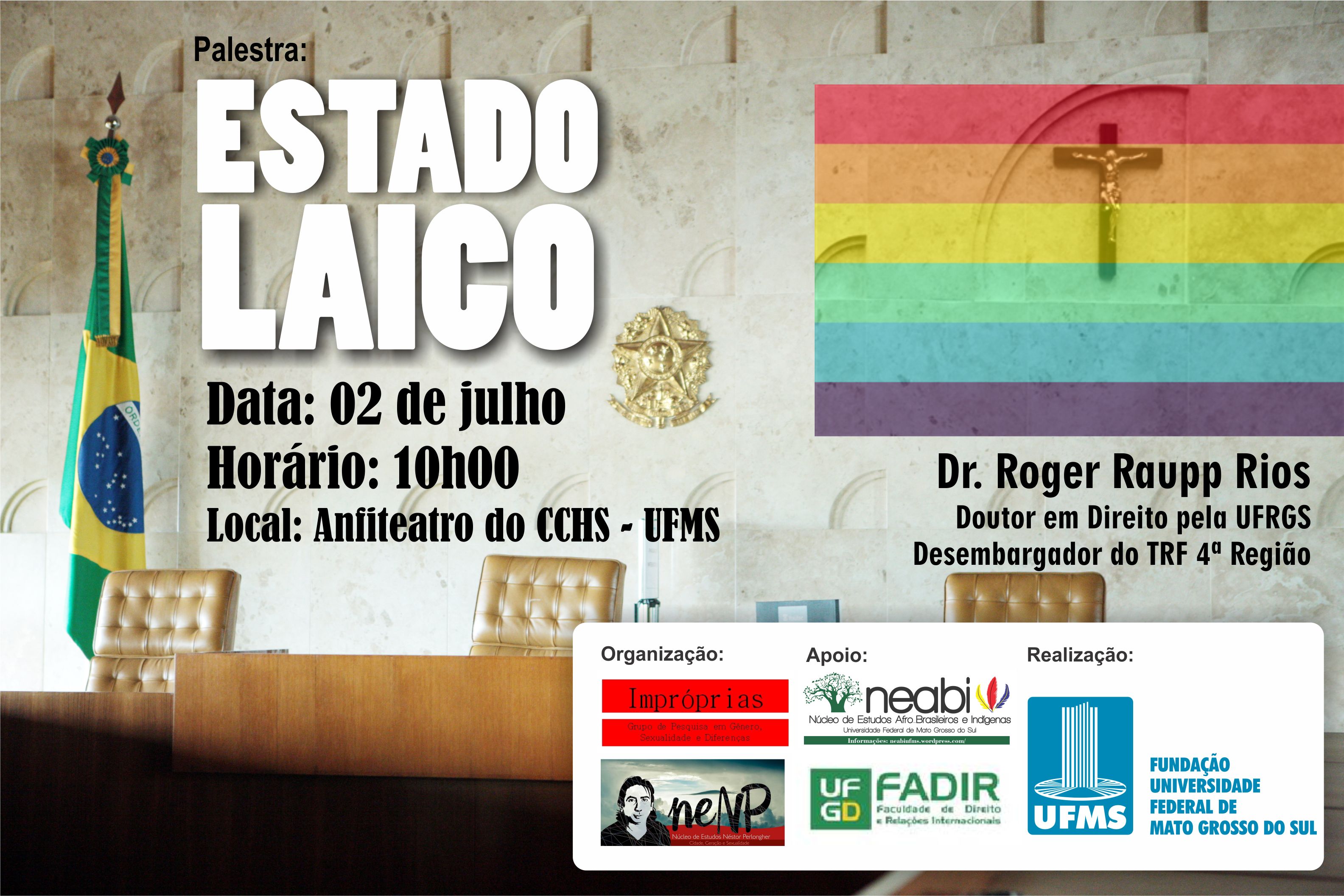 No dia 2 de julho, às 10h, o anfiteatro do Centro de Ciências Humanas e Sociais (CCHS) da UFMS recebe a palestra “Estado Laico”. O palestrante será o Desembargador do TRF 4ª Região e Doutor em Direito pela Universidade Federal do Rio Grande do Sul (UFRGS), Roger Raupp Rios. A organização é do Impróprias – Grupo de Pesquisa em Gênero, Sexualidade e Diferenças – e do Nenp – Núcleo de Estudos Néstor Perlongher Cidade Geração e Sexualidade.