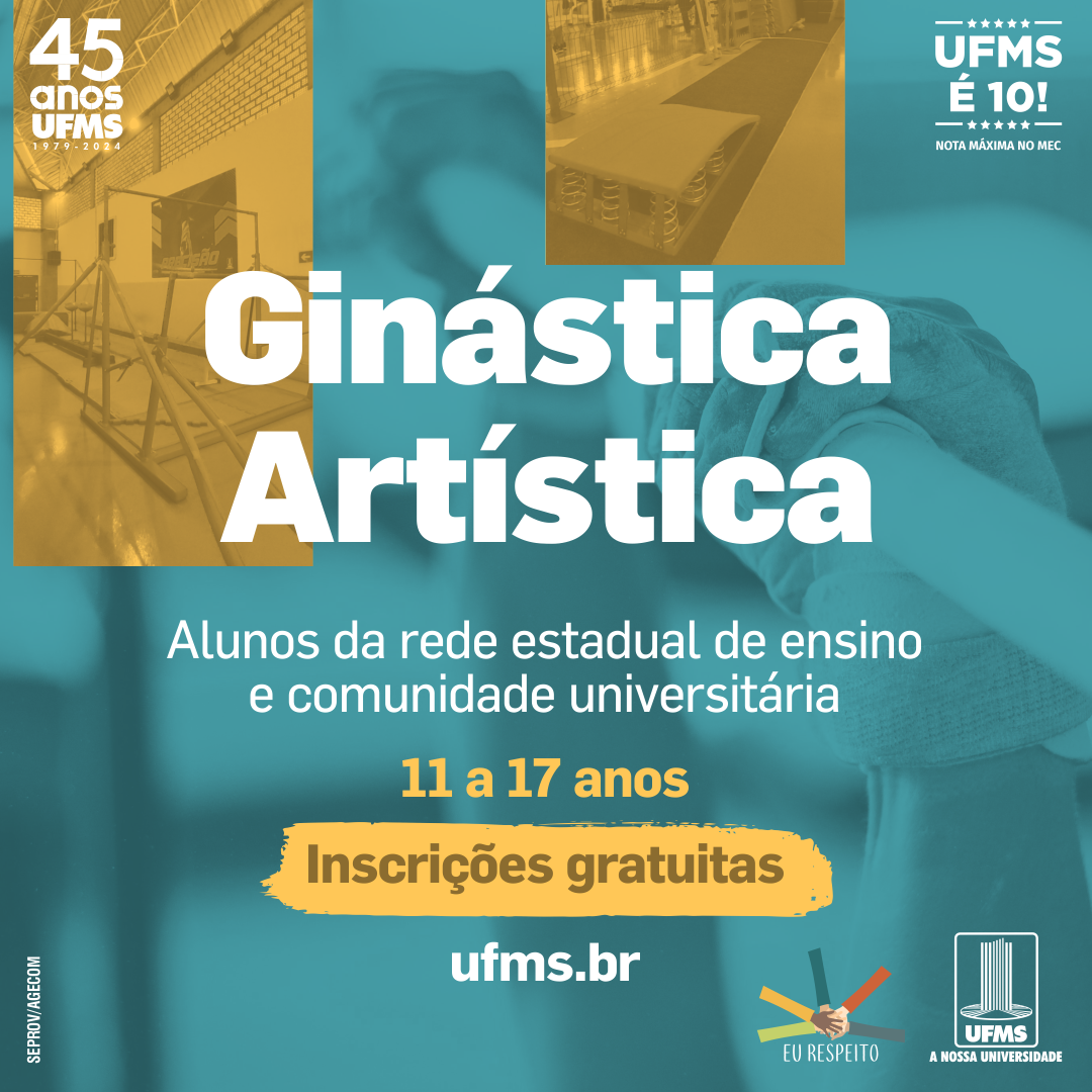 Estão abertas as inscrições para aulas gratuitas de ginástica artística na Cidade Universitária. São 70 vagas para crianças e adolescentes, sendo 60 destinadas para alunos da rede estadual de ensino e 10 para filhos de servidores, estudantes e colaboradores. O cadastro da comunidade universitária teve início na quarta-feira, 5, e deve ser feito por meio do formulário on-line até o dia 14 de junho. Já para a comunidade externa, o cadastro permanece aberto até o preenchimento total das vagas ofertadas pelo Programa MS Desporto Escolar (Prodesc).