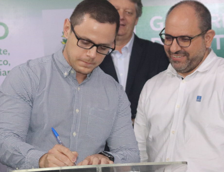 Professor Cauê e reitor Turine durante a assinatura do convênio com a Fundect