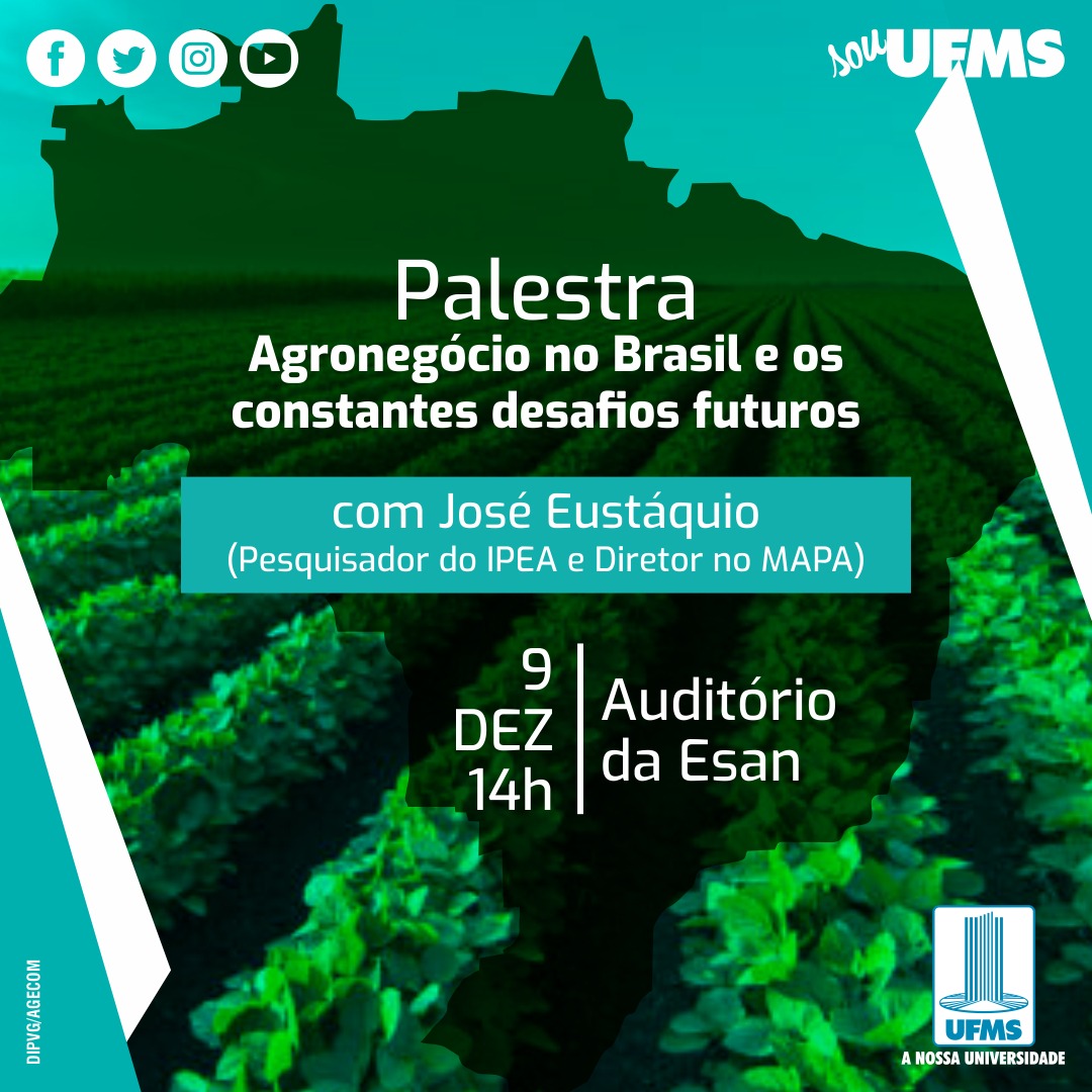 O objetivo da palestra é compartilhar conhecimento sobre o que está ocorrendo no agronegócio e as perspectivas para o futuro. Além de promover o diálogo entre professores, pesquisadores, estudantes e profissionais da área. “Ocorrerá o intercâmbio de conhecimento entre instituições, construção de cenários futuros para os pesquisadores e alunos da Esan/UFMS”, ressaltou a professora Doutora do Programa de Pós-Graduação em Administração (PPGAD), Adriana Vieira.