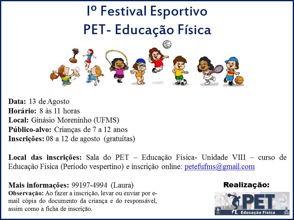 No dia 13 de agosto (sábado) o Programa de Educação Tutorial (PET) da Educação Física realiza no 1º Festival Esportivo. A ação é voltada a crianças de 7 a 12 anos de idade e ocorrerá no Ginásio Moreninho das 8h às 11h.