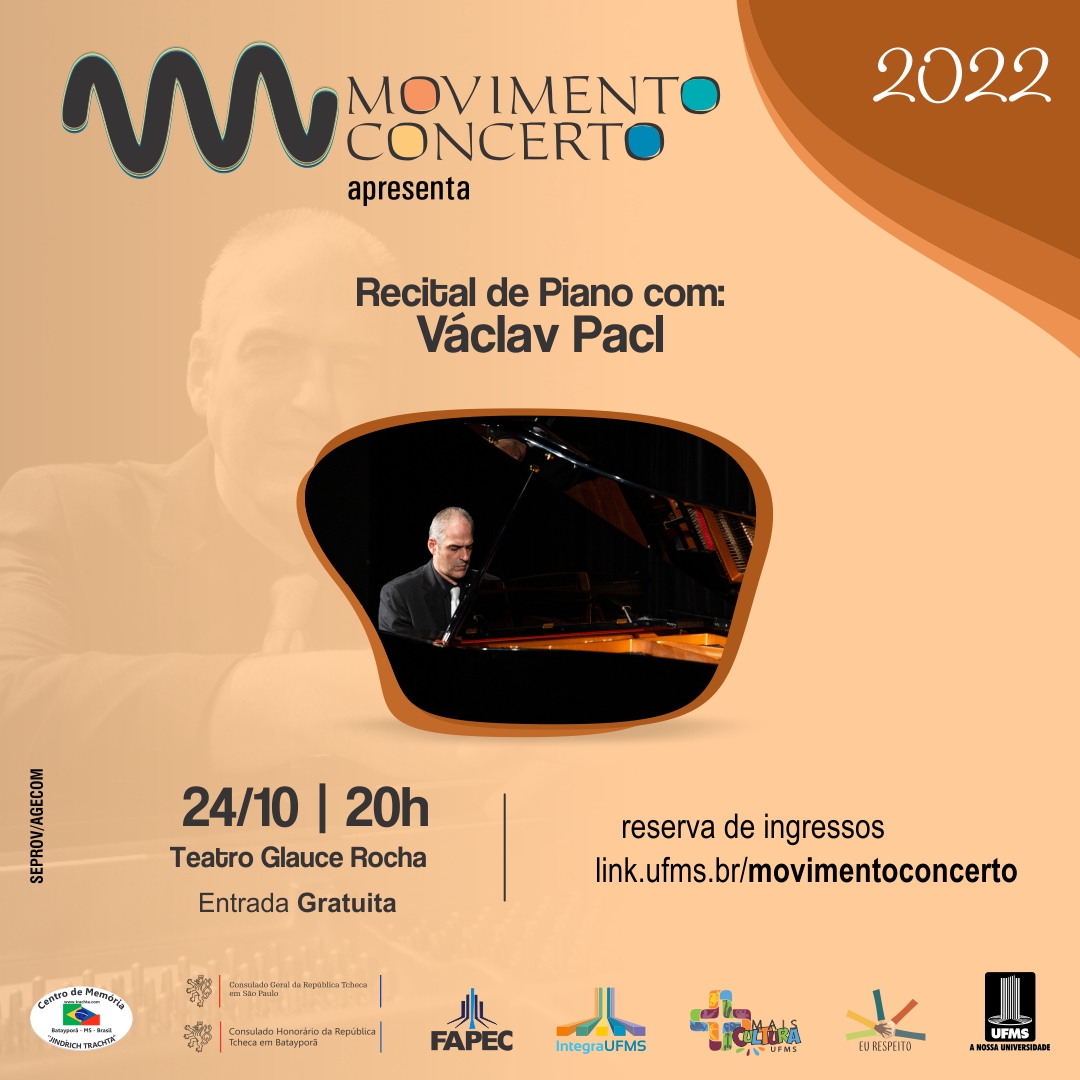 O Movimento Concerto tem uma programação especial para a abertura da semana do Integra UFMS 2022, com a apresentação do pianista tcheco Václav Pacl. Parte da campanha Eu Respeito, o concerto ocorre no dia 24 de outubro, às 20 horas, no Teatro Glauce Rocha.