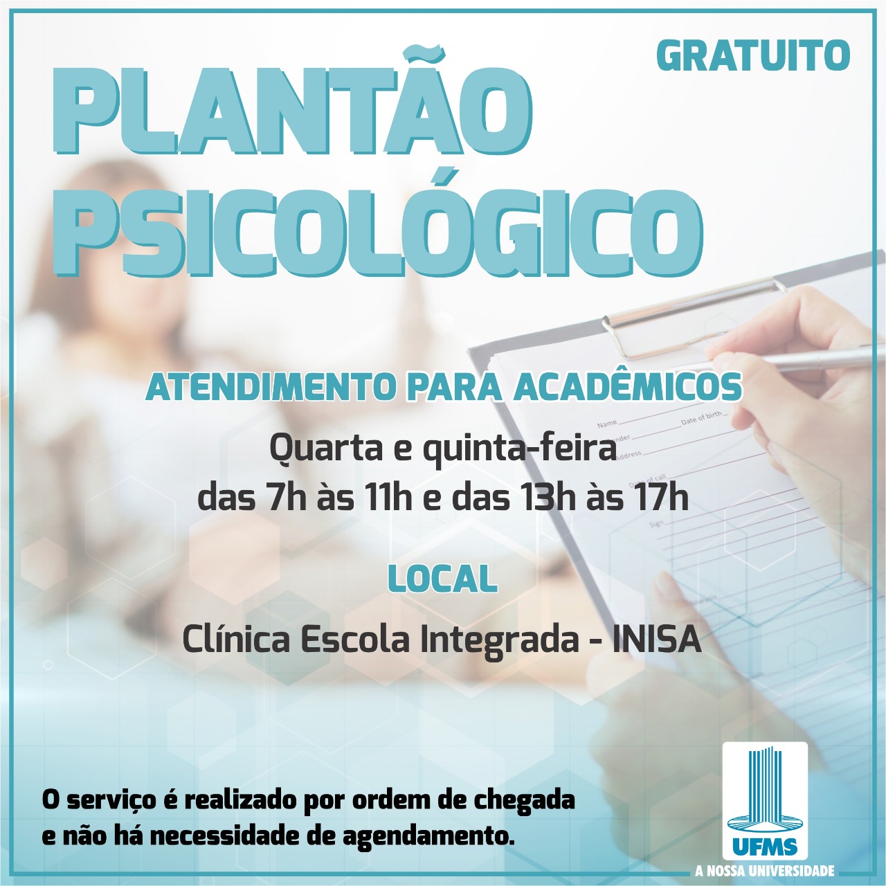A partir desta semana, o Plantão Psicológico estende o atendimento para quarta e quinta, das 7h às 11h e das 13h às 17h. O serviço é oferecido aos acadêmicos da Cidade Universitária pela Divisão de Saúde e Alimentação Estudantil (Disae) da Pró-reitoria de Assuntos Estudantis.