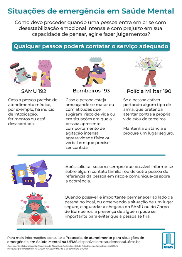Por fim, a comunidade externa também pode buscar atendimento de forma gratuita neste link, por meio do Serviço Escola de Psicologia da Fach, ou pelo Ambulatório de Psiquiatria e do Serviço de Psicologia Hospitalar do Hospital Universitário Maria Aparecida Pedrossian (Humap-UFMS/Ebserh), mediante o Sistema de Regulação do SUS.