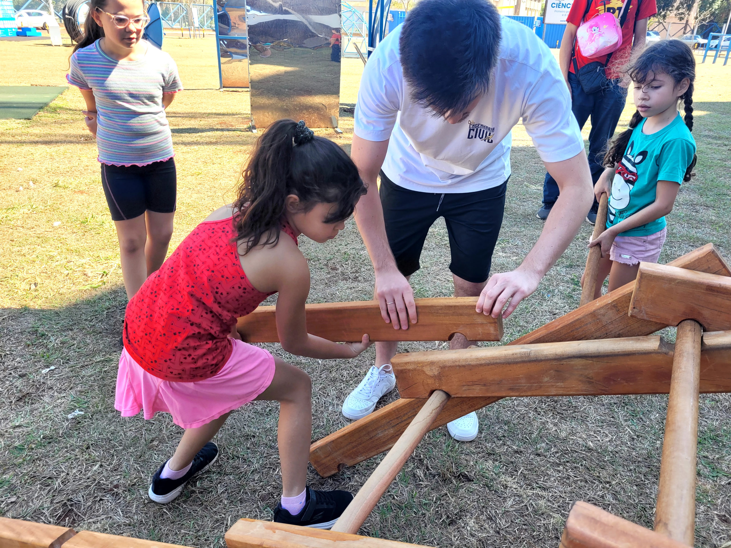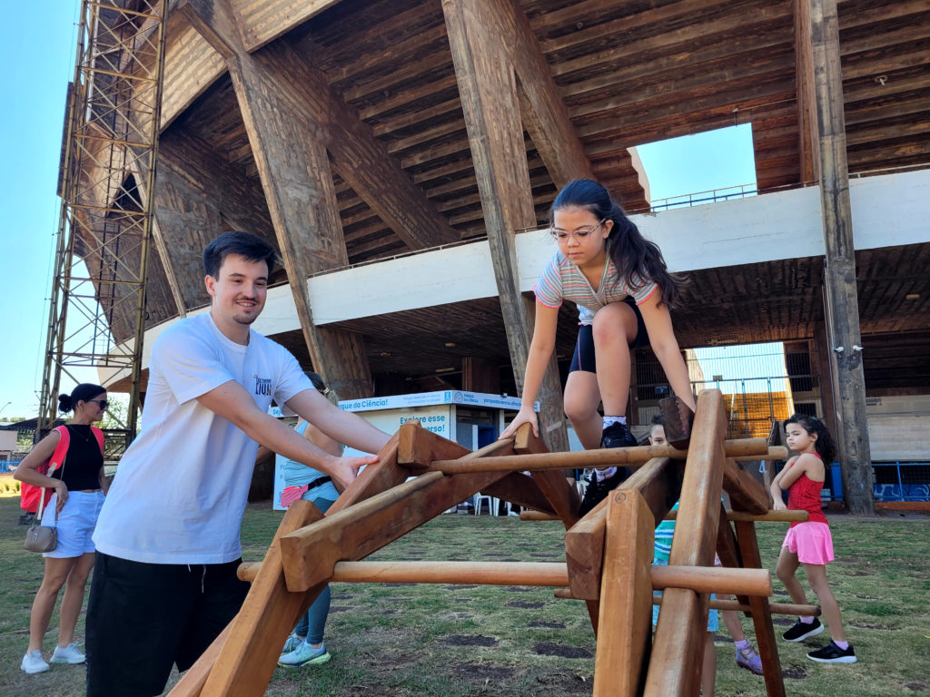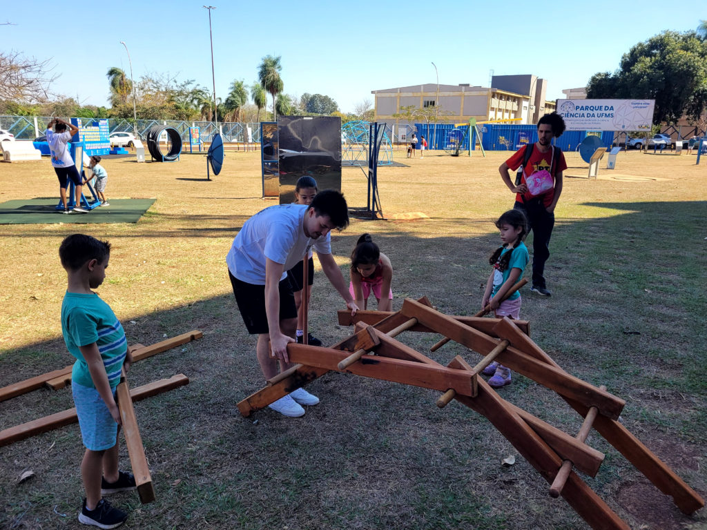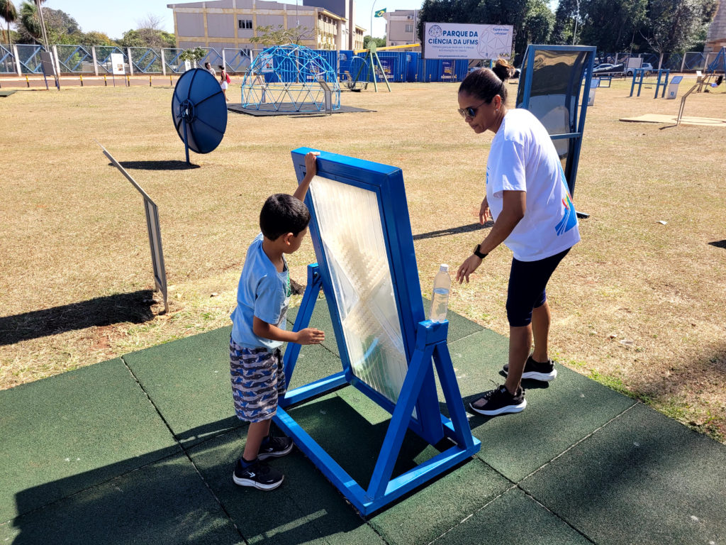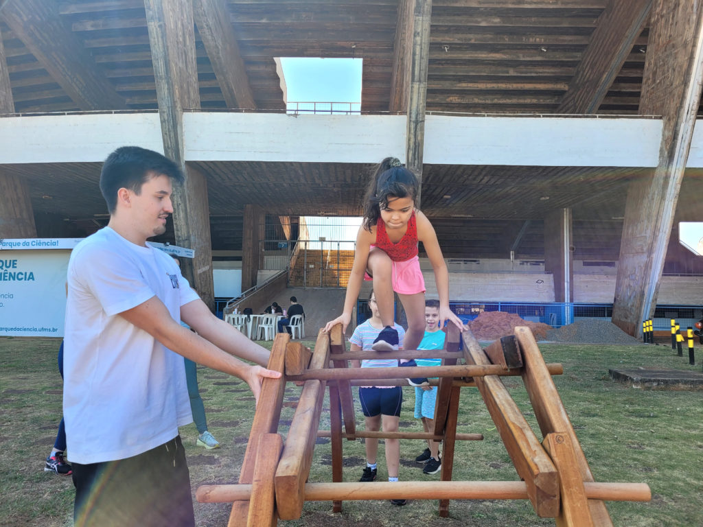 Unindo ciência e diversão, a edição do Sábado no Parque da Ciência deste mês foi realizada em conjunto com a programação da Volta UFMS. O técnico-administrativo da UFMS Raphael Granato, pai da Ariel, trouxe a filha de 2 anos para brincar nos monumentos interativos, como o Pêndulo de Newton, os Espelhos Curvos, o Balanço de Ressonância, a Alavanca de Arquimedes, entre outros. “A gente precisa ter esses espaços para estar também, auxiliando na questão de gastar energia, dela fazer outras coisas, não ficar só dentro de casa. Então, eu acho ótimo, gosto bastante”, comentou.