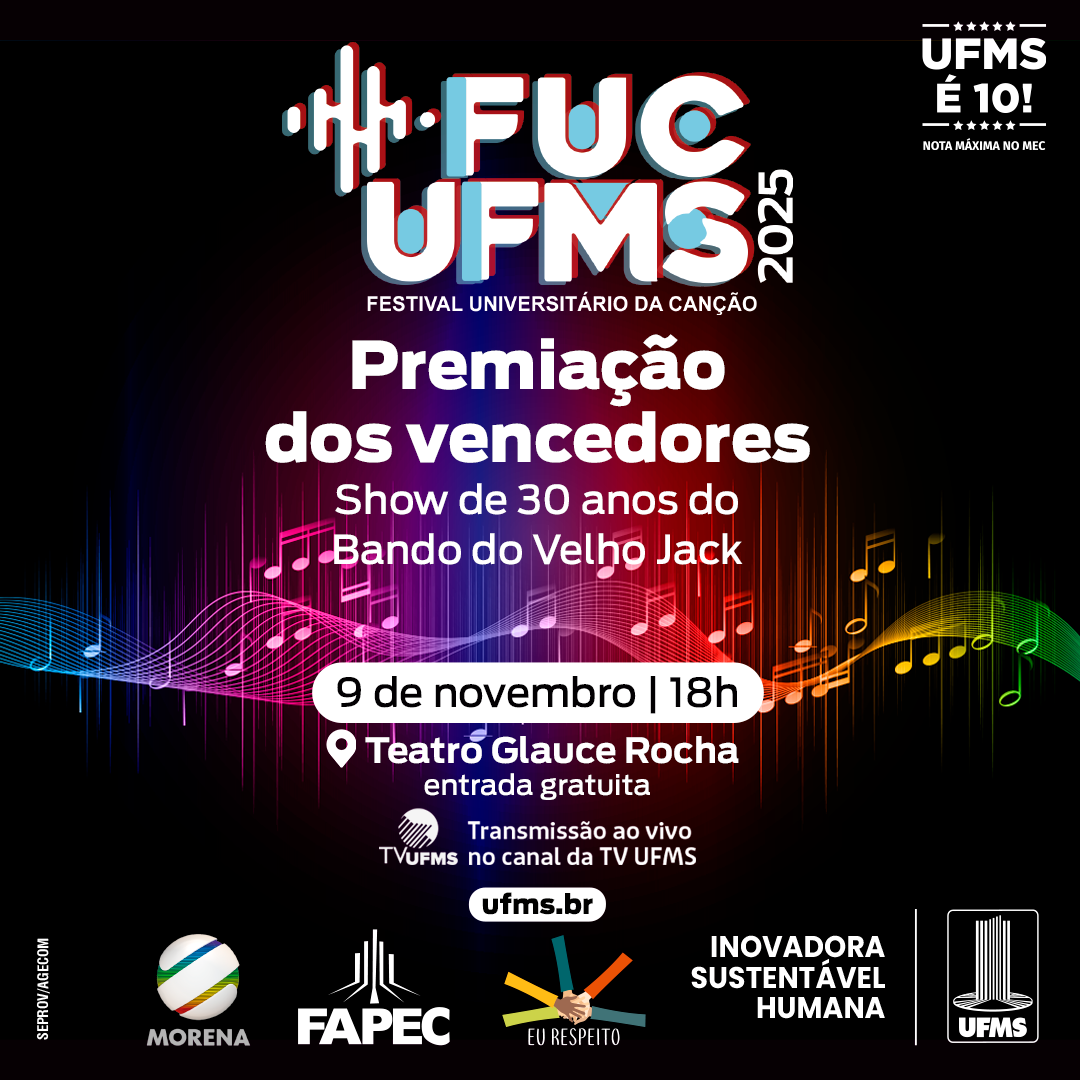 Os vencedores do Festival Universitário da Canção (FUC) UFMS 2025 serão anunciados no dia 9 de novembro no Teatro Glauce Rocha na Cidade Universitária. A premiação inicia às 18h, será aberta ao público e, além da apresentação das canções finalistas nas categorias Canção Popular Regional e Canção Popular Urbana, terá um show em comemoração aos 30 anos do O Bando do Velho Jack.
