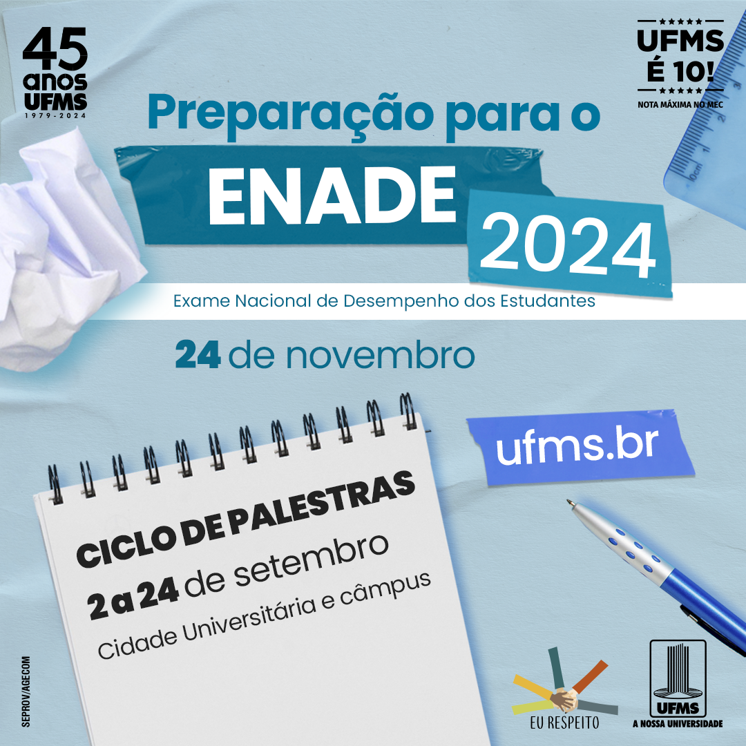 Entre os dias 2 e 24 de setembro, a UFMS, por meio da Diretoria de Avaliação Institucional, promove um ciclo de palestras e rodas de conversas para preparar e sensibilizar os estudantes da Cidade Universitária e dos câmpus sobre a importância do Exame Nacional de Desempenho dos Estudantes (Enade) 2024. Neste ano, as provas serão aplicadas no dia 24 de novembro em todo o país.