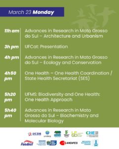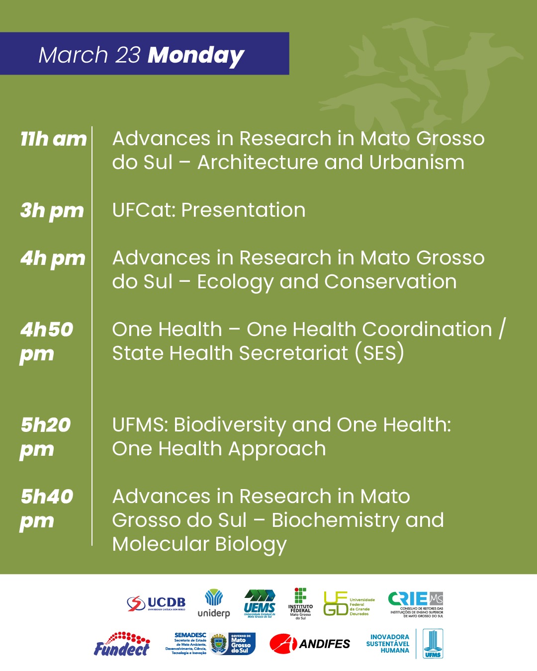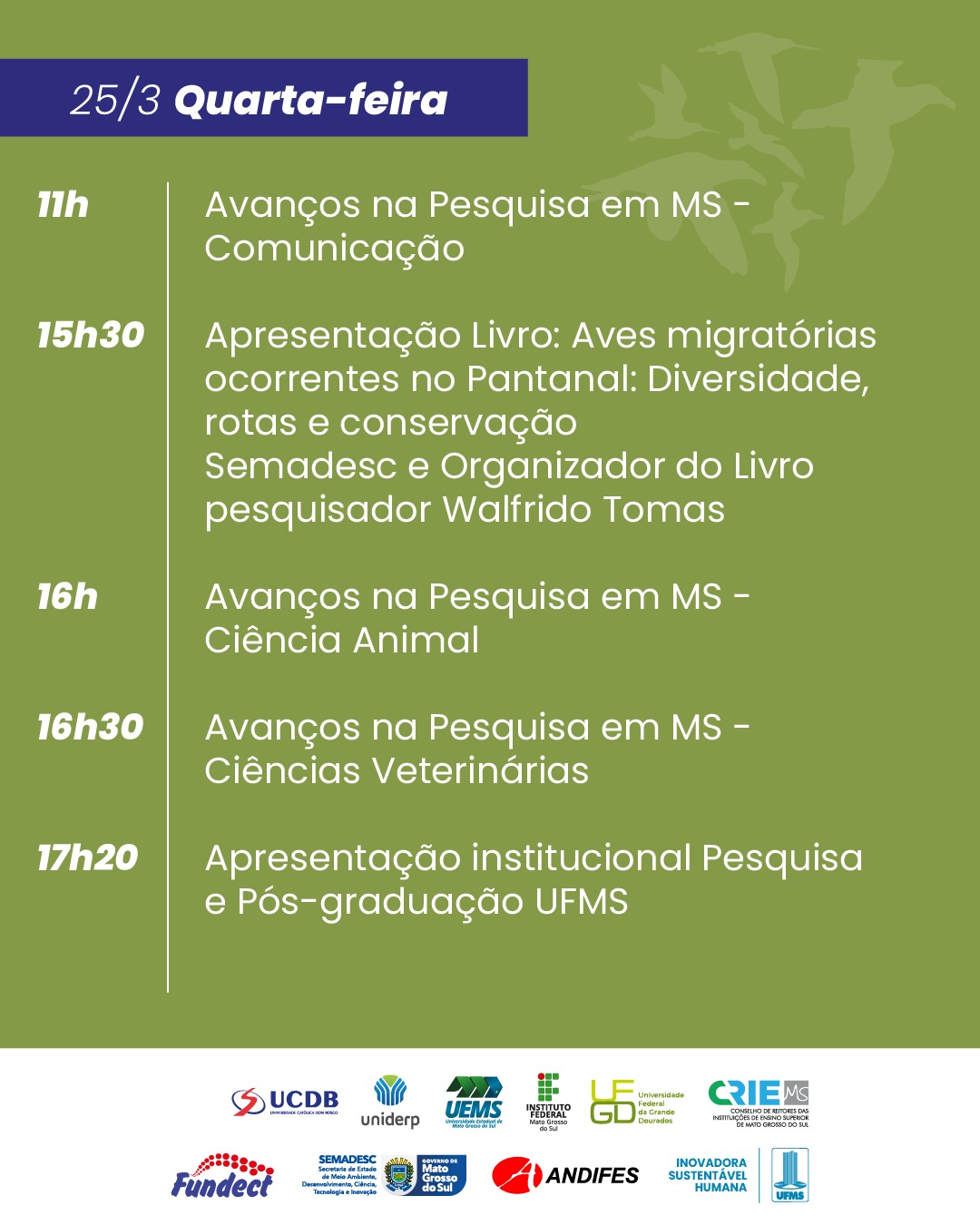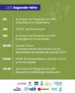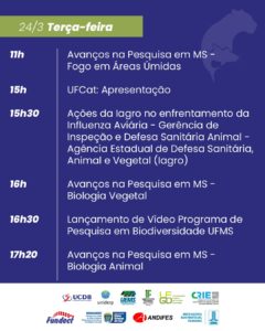 A programação contempla apresentações das tecnologias geradas nas pesquisas da UFMS, lançamento de vídeo sobre Biodiversidade, livro sobre Aves migratórias ocorrentes no Pantanal: Diversidade, rotas e conservação, trilha rupestre, frutos do cerrado, coleções zoológicas e herbário, farmácia verde, e apresentações do Instituto Federal de MS, Universidade Federal da Grande Dourados, Universidade Federal de Catalão, Universidade Federal de Jataí, entre outras.