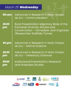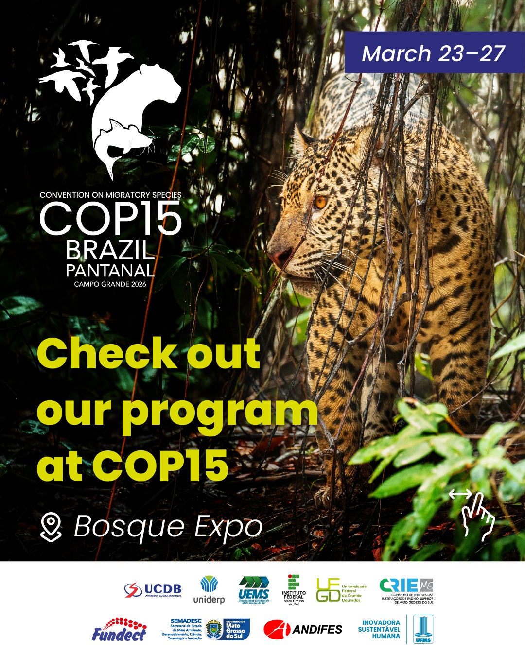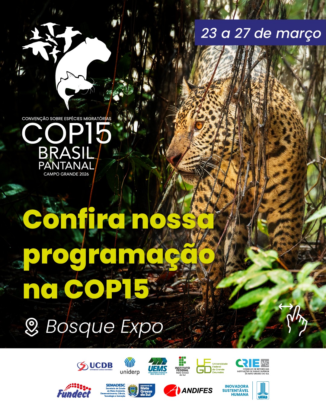 De 23 a 27, das 9h30 às 18h30, serão promovidas ações de ciência, cultura e tecnologia no estande da COP15 no Bosque Expo, que vão abordar pesquisas ligadas às espécies migratórias e também vinculadas ao Pantanal, Cerrado, Povos Originários e ao estado de Mato Grosso do Su.