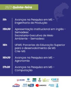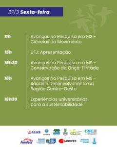 “É uma honra para a UFMS organizar as atividades deste espaço tão significativo para o nosso estado e para nosso país, como uma vitrine da ciência, da formação e do conhecimento de excelência gerado em nossas universidades, com fomento do Governo Federal e do estado de Mato Grosso do Sul, com a Semadesc e a Fundect. Estamos muito orgulhosos de fazer parte deste movimento em prol da conservação e do futuro da nossa sociedade”, disse a reitora Camila Ítavo, presidente do Crie-MS e vice-presidente da Andifes.