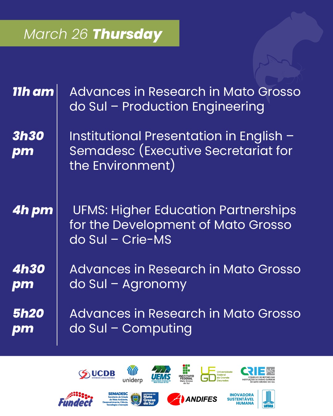 A programação foi organizada pela UFMS em parceria com a Secretaria de Meio Ambiente, Desenvolvimento, Ciência, Tecnologia e Inovação (Semadesc), do governo de MS, a Fundação de Apoio ao Desenvolvimento do Ensino, Ciência e Tecnologia do Estado de MS (Fundect), o Conselho de Reitores e Reitoras das Instituições de Ensino Superior de MS (Crie-MS) e a Associação Nacional de Dirigentes das Instituições Federais de Ensino Superior (Andifes). O estande está ao lado do Espaço Brasil, organizado pelo Ministério do Meio Ambiente e Mudança do Clima, no Bosque Expo.