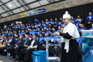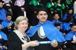 O reitor Marcelo Turine parabenizou todos os formandos e entregou, pela primeira vez, a menção honrosa para estudantes que se destacaram em cada um dos cursos. Em seu discurso de agradecimento, o reitor evidenciou a missão dos estudantes a partir da formação. “Como os mais novos profissionais da UFMS, vocês têm uma missão belíssima de ajudar nosso país com trabalho, dignidade, ética, respeito e profissionalismo. Em Mato Grosso do Sul, temos somente 21% da população com curso superior. Hoje vocês nos ajudam a ter um indicador cada vez melhor. Fortaleçam e valorizem esse título que vocês receberam de uma universidade pública e de qualidade”, destaca.