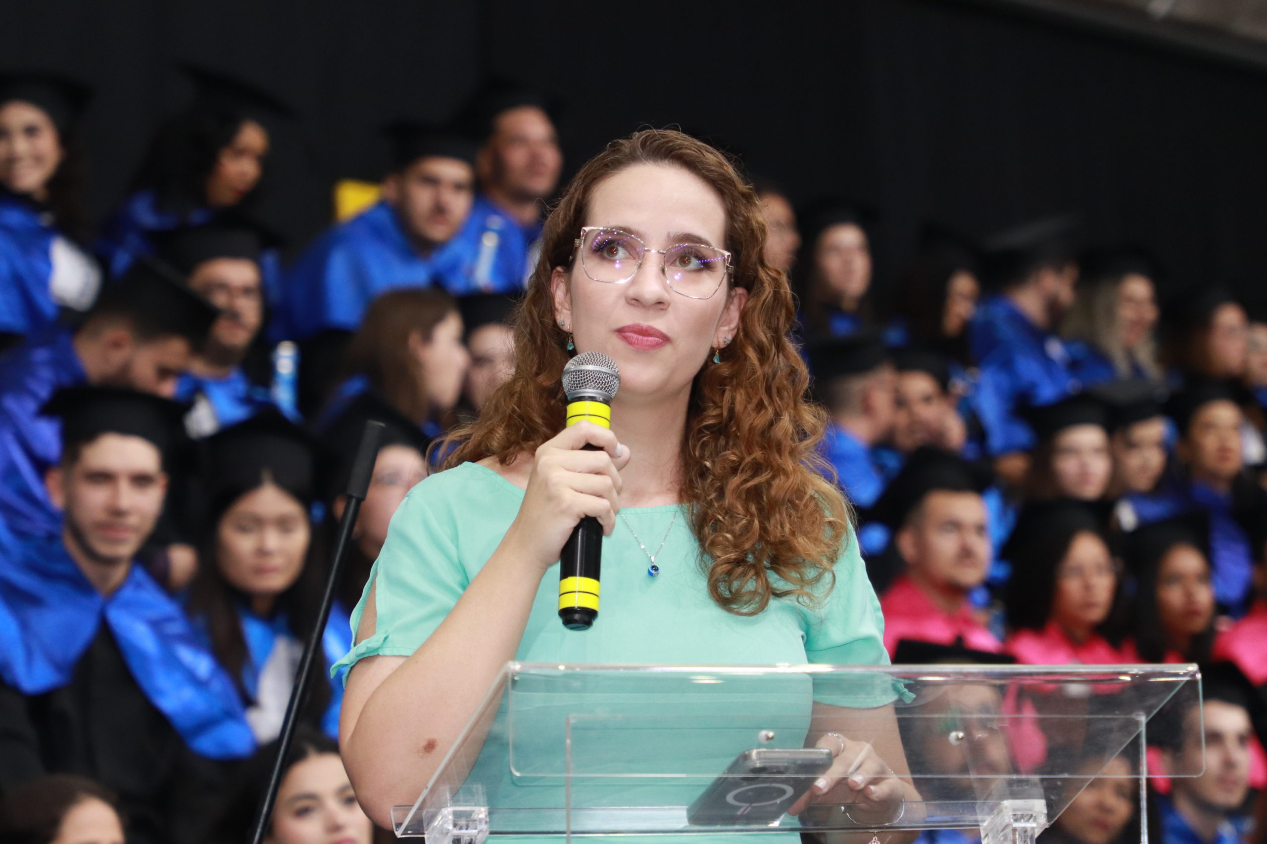 A professora Yasmim Gomes Casagrande representou os docentes homenageados da noite. “Tenho certeza que todos vocês têm trajetória que imaginaram até chegar a essa noite, essa trajetória veio cercada de muitos planos, pessoas, dias de estudo, fins de semana, momentos com e sem famílias. Não é fácil chegar até aqui, são os desafios que fazem a gente dar valor para o processo. Essa noite é a coroação de um sonho”.