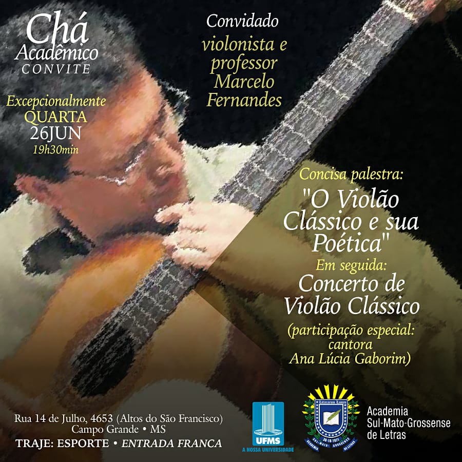A palestra terá o tema “O Violão Clássico e sua Poética”, onde o professor irá explicar as origens e os usos do violão. Logo após, será realizada uma apresentação musical com a participação especial da cantora Ana Lúcia Gaborim, também professora da UFMS, e do egresso da Universidade Fernando Dandreia, que recitará poesias.