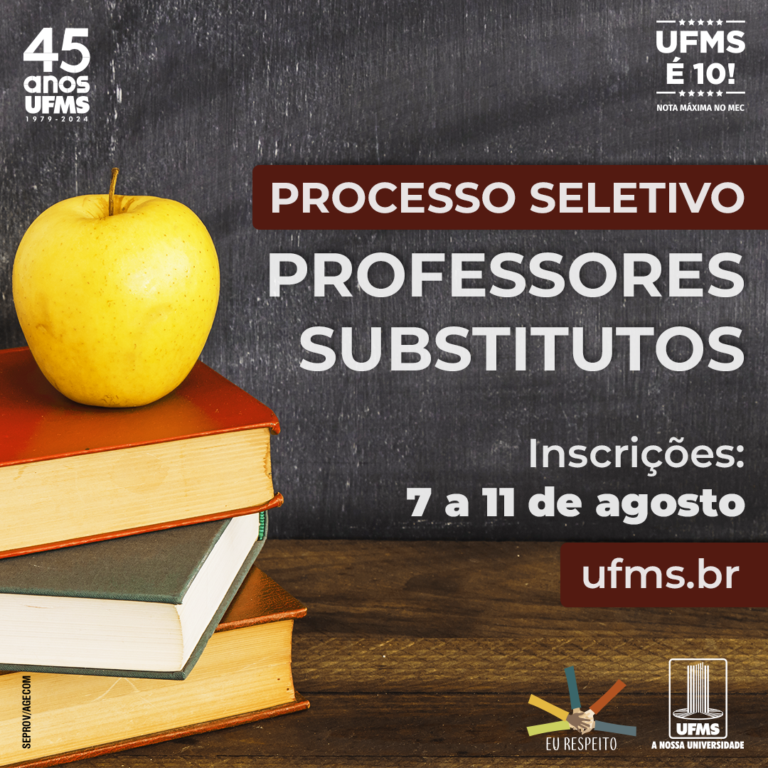 Entre 7 e 11 de agosto, a UFMS abre inscrições no processo seletivo para 29 professores substitutos. Há vagas para dez unidades da Cidade Universitária e para os Câmpus do Pantanal, Aquidauana, Paranaíba, Coxim, Naviraí, Ponta Porã e Três Lagoas