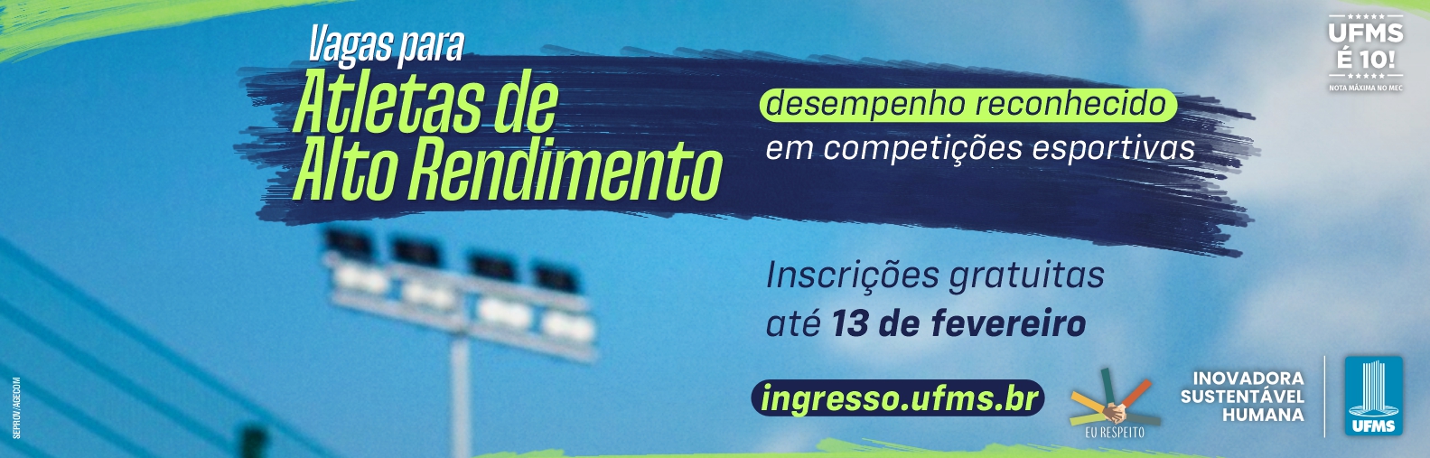Por meio do Programa Pró-Atleta UFMS 2025, a Universidade oferta vagas em cursos de graduação a atletas de alto rendimento com desempenho reconhecido em competições esportivas nas modalidades dos Jogos Olímpicos, Paraolímpicos ou Universitários Brasileiros em 2022, 2023 e 2024. A candidatura deve ser feita até 13 de fevereiro neste link.