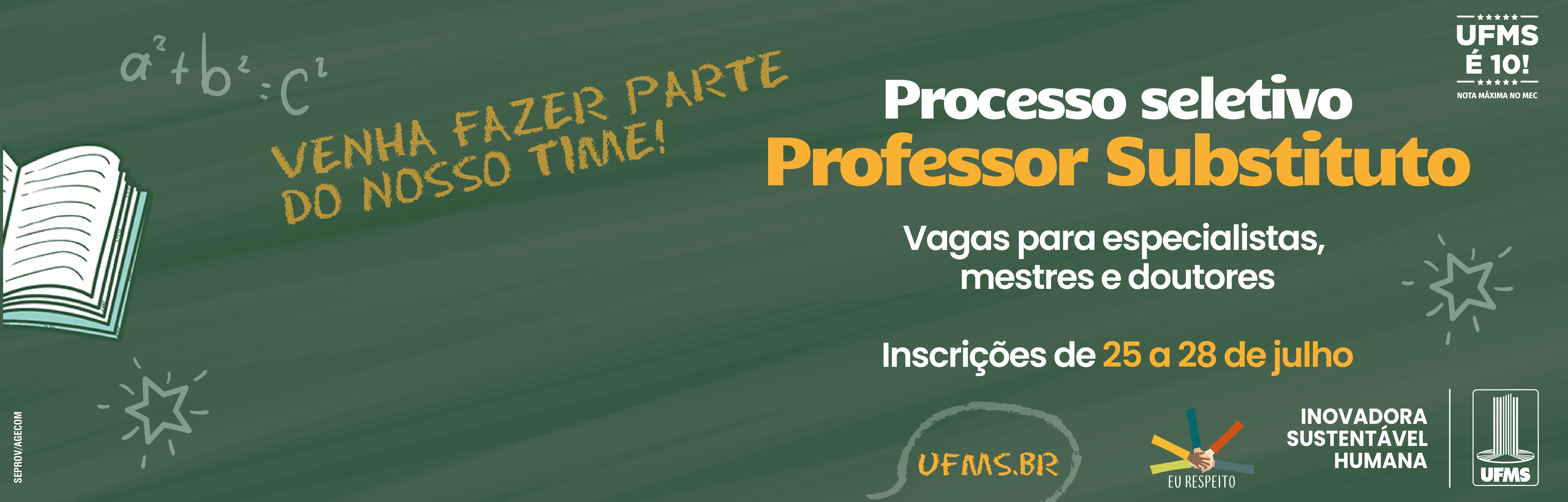 Universidade abre inscrições para processo seletivo de professores substitutos em diversas áreas de conhecimento. As vagas são para atuação no segundo semestre de 2025 na Cidade Universitária e nos Câmpus da UFMS de Aquidauana (CPaq), Chapadão do Sul (CPCS), Coxim (CPCX), Nova Andradina (CPNA), Paranaíba (CPar), Três Lagoas (CPTL) e do Pantanal (CPan). O período de inscrição vai de 25 a 28 de julho na página concursos.ufms.br.