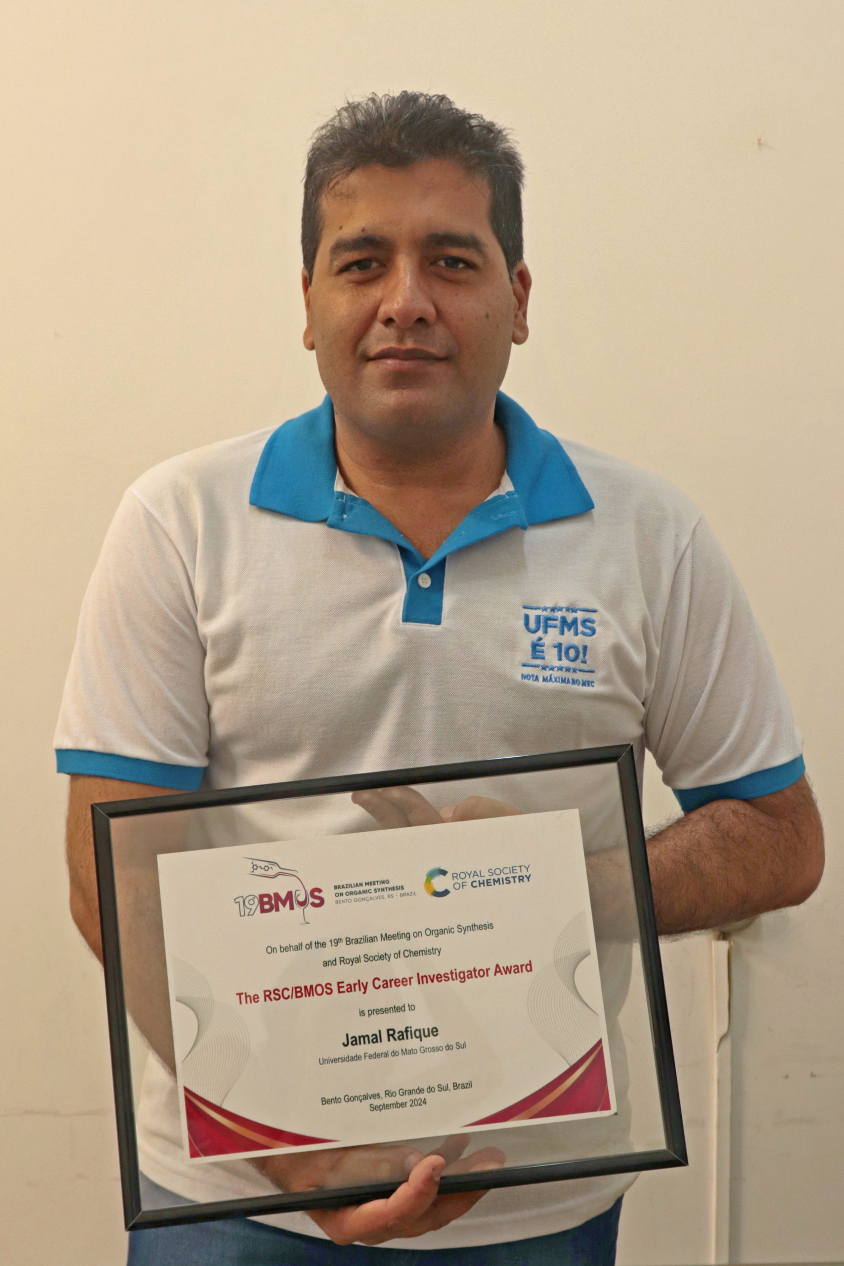 O professor do Instituto de Química (Inqui) Jamal Rafique recebeu o prêmio RSC/BMOS Early Career Investigator durante a cerimônia de encerramento do 19º Encontro Brasileiro de Síntese Orgânica. Essa edição do evento científico internacional bianual foi realizado em Bento Gonçalves (RS).