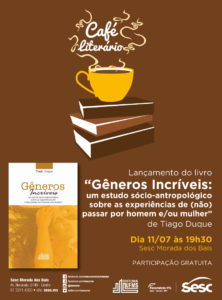 No próximo dia 11 de julho, às 19h30, o professor Tiago Duque, do Mestrado em Antropologia Social da Faculdade de Ciências Humanas e do Mestrado em Educação do Campus Pantanal lançará o livro “Gêneros Incríveis – um estudo sócio antropológico sobre as experiências de (não) passar por homem e/ou mulher” no Café Literário do SESC.