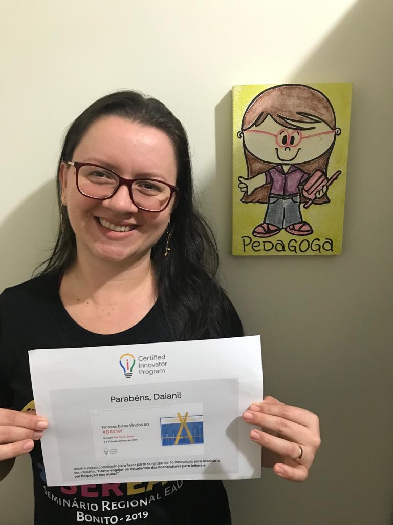 A professora Daiani Damm Tonetto Riedner, lotada na Secretaria Especial de Educação a Distância (Sead), foi selecionada para participar do programa Google Innovator 2019. Pesquisadores de diversos locais do Brasil participaram do processo seletivo e apenas 36 foram selecionados.