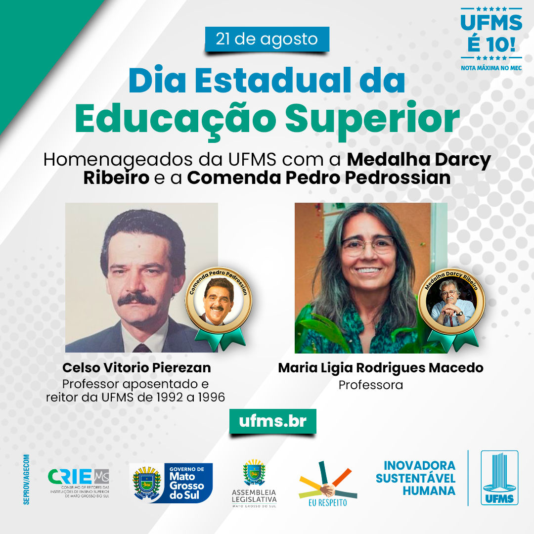Em alusão ao Dia Estadual da Educação Superior, os professores Maria Lígia Rodrigues Macedo, Gilson Rodolfo Martins e Celso Vitorio Pierezan serão homenageados pela Assembleia Legislativa de Mato Grosso do Sul (Alems) com a Medalha Darcy Ribeiro e a Comenda Pedro Pedrossian.