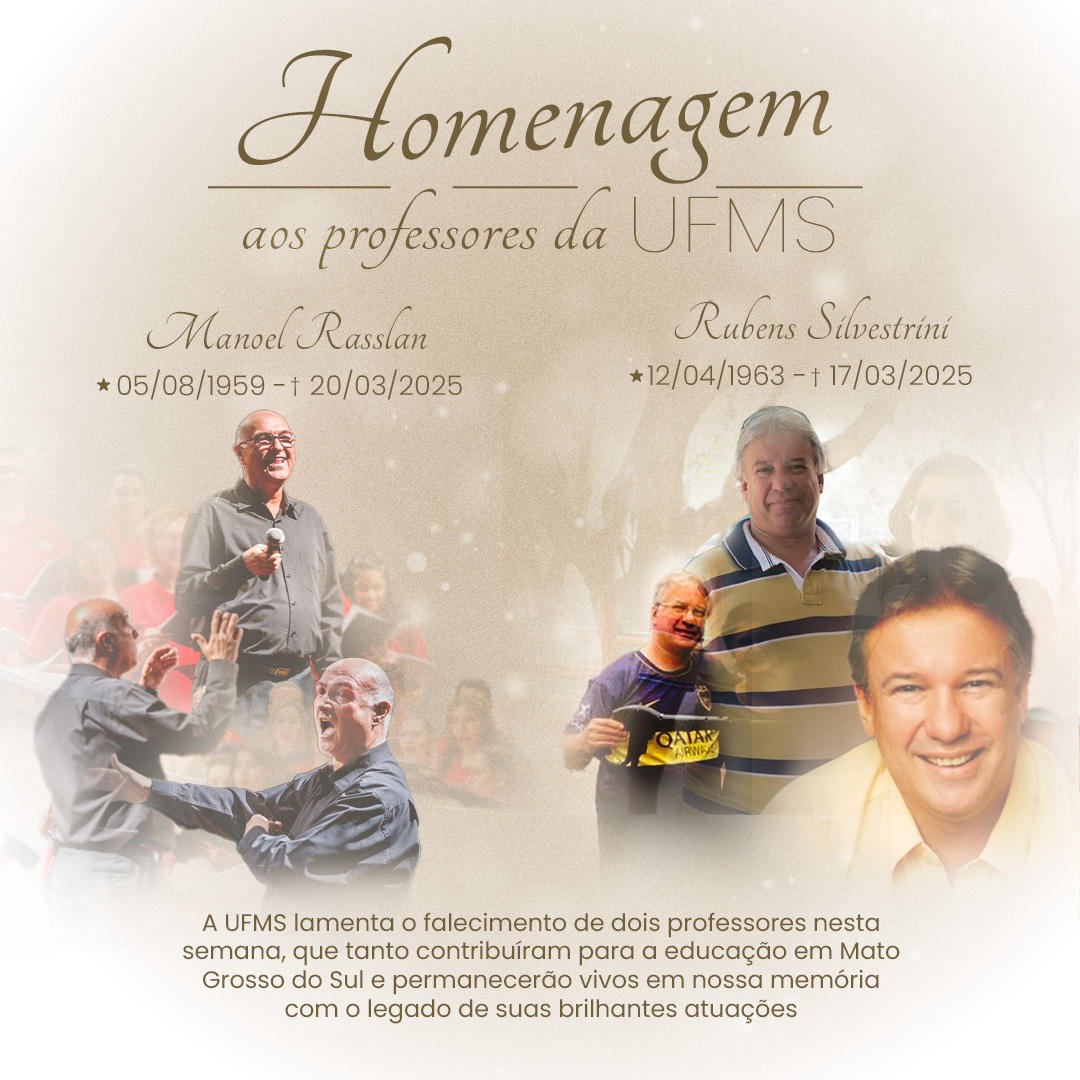 A UFMS lamenta o falecimento de dois professores ocorridos nesta semana. O professor da Faculdade de Engenharias, Arquitetura e Urbanismo e Geografia (Faeng) Rubens Milton Silvestrini de Araújo, na última segunda, 17, e o professor da Faculdade de Artes, Letras e Comunicação (Faalc) Manoel Câmara Rasslan, nesta quinta, 20.