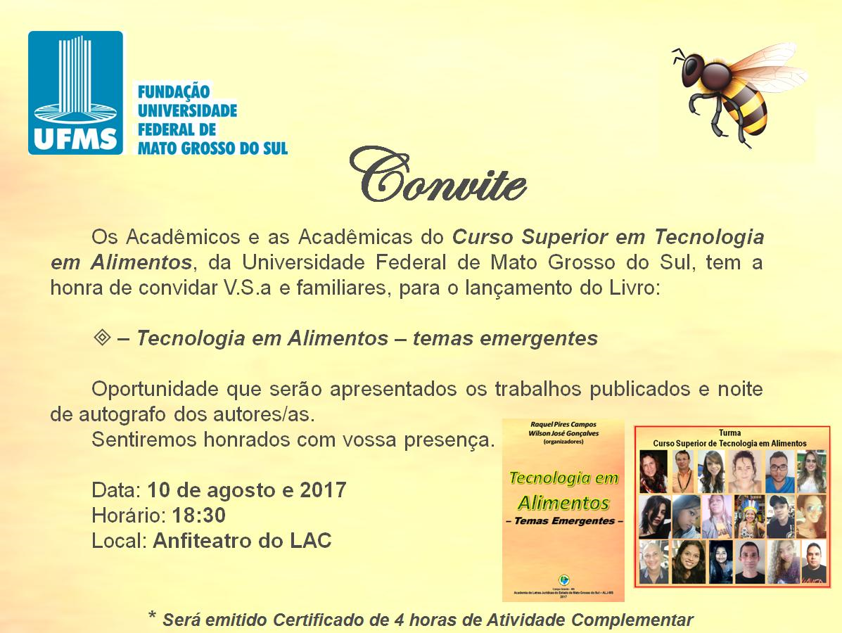 No dia 10 de agosto de 2017 os acadêmicos, acadêmicas e professores do curso de Tecnologia em Alimentos da UFMS realizarão o lançamento do livro “Tecnologia em Alimentos – temas emergentes”. A obra foi organizada pelos professores Raquel Pires Campos e Wilson José Gonçalves da Universidade e traz textos produzidos pelos alunos para a disciplina Produção de Texto e Metodologia Científica, cursada no primeiro semestre deste ano.