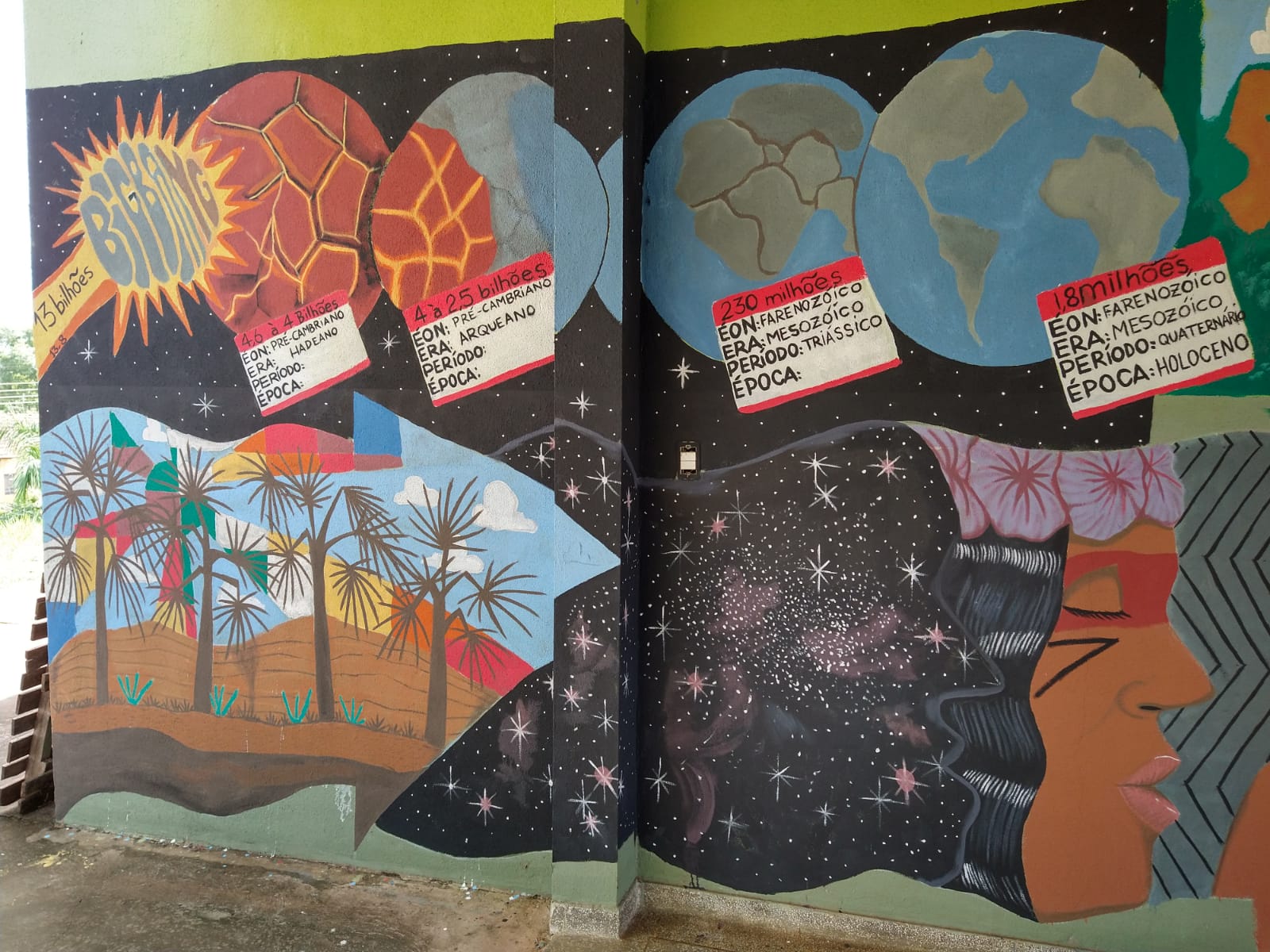 Para quem entra na escola, é impossível não se encantar com o mural didático. As cores chamam a atenção e as imagens, cheias de detalhes, contam a história da formação do planeta.