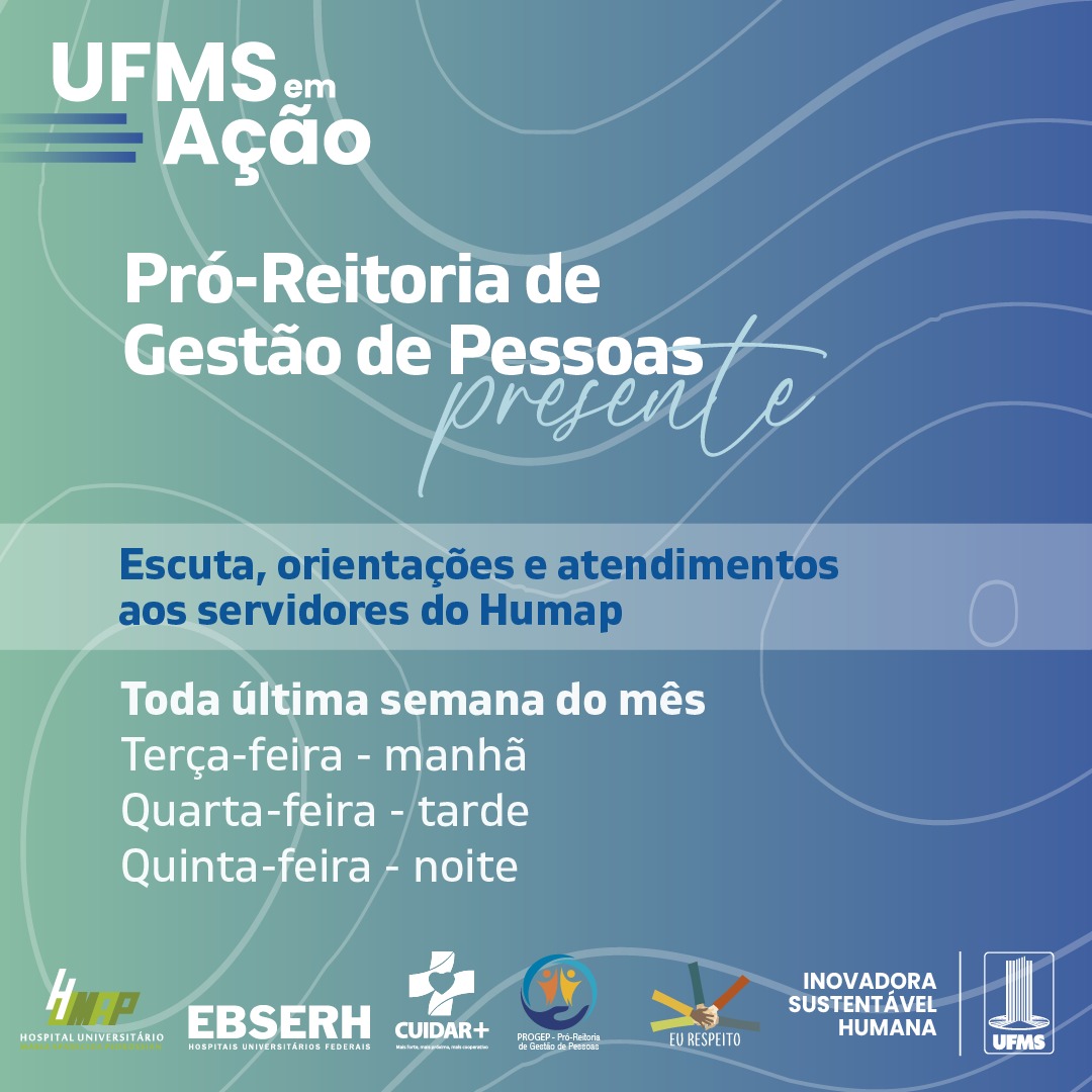 A partir deste mês de março até dezembro, o programa UFMS em Ação por meio da Progep Presente estará em plantão para atender os servidores da Universidade no Hospital Universitário Maria Aparecida Pedrossian (Humap/UFMS/Ebserh). A equipe da Pró-Reitoria de Gestão de Pessoas estará sempre na última semana do mês, na terça, quarta e quinta-feira.