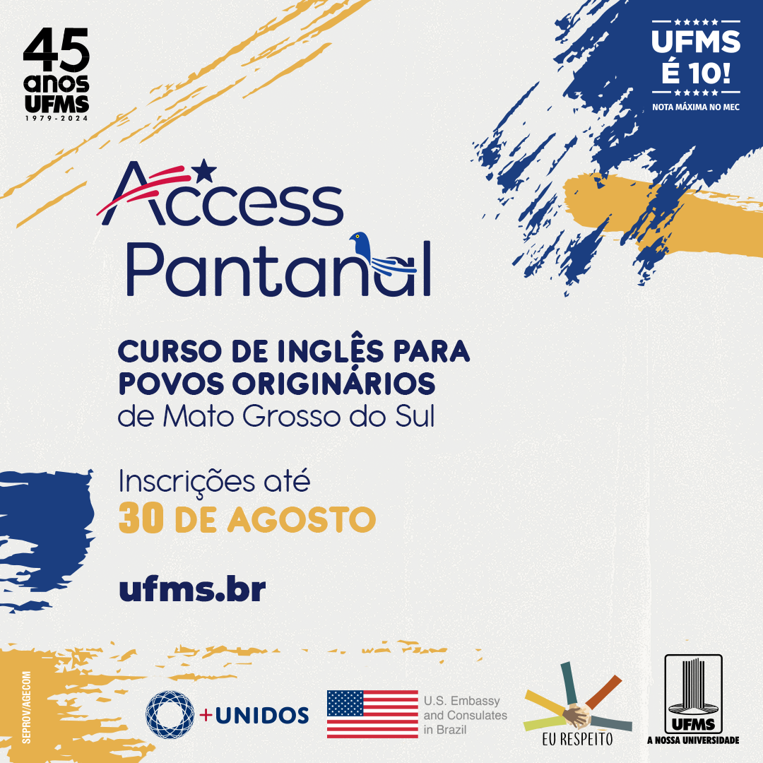 Os povos originários de Mato Grosso do Sul podem se inscrever até 30 de agosto no Programa Acess Pantanal. A iniciativa oferece vagas para o curso gratuito de língua inglesa voltado para a população indígena do Estado, por meio de uma parceria entre a UFMS, por meio do Câmpus de Aquidauana (CPaq); o Consulado Geral dos Estados Unidos; e o Grupo Mais Unidos. Os interessados devem preencher o formulário disponível aqui.