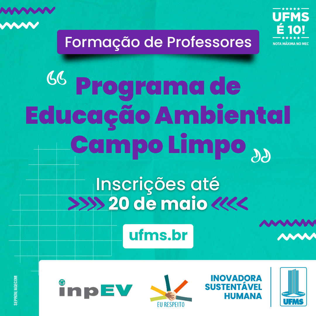 Em parceria com a UFMS, o Instituto Nacional de Processamento de Embalagens Vazias (inpEV) abre inscrições para a formação de professores do Programa de Educação Ambiental (PEA) Campo Limpo, com o tema Mudanças climáticas e a gestão compartilhada de resíduos sólidos. A iniciativa gratuita, com certificação e vagas limitadas, será realizada no dia 22 de maio, com quatro turmas em diferentes horários: às 8h, 10h30, 13h30 e às 16h, no Complexo EaD e Escola de Extensão, na Cidade Universitária. As inscrições podem ser feitas aqui.