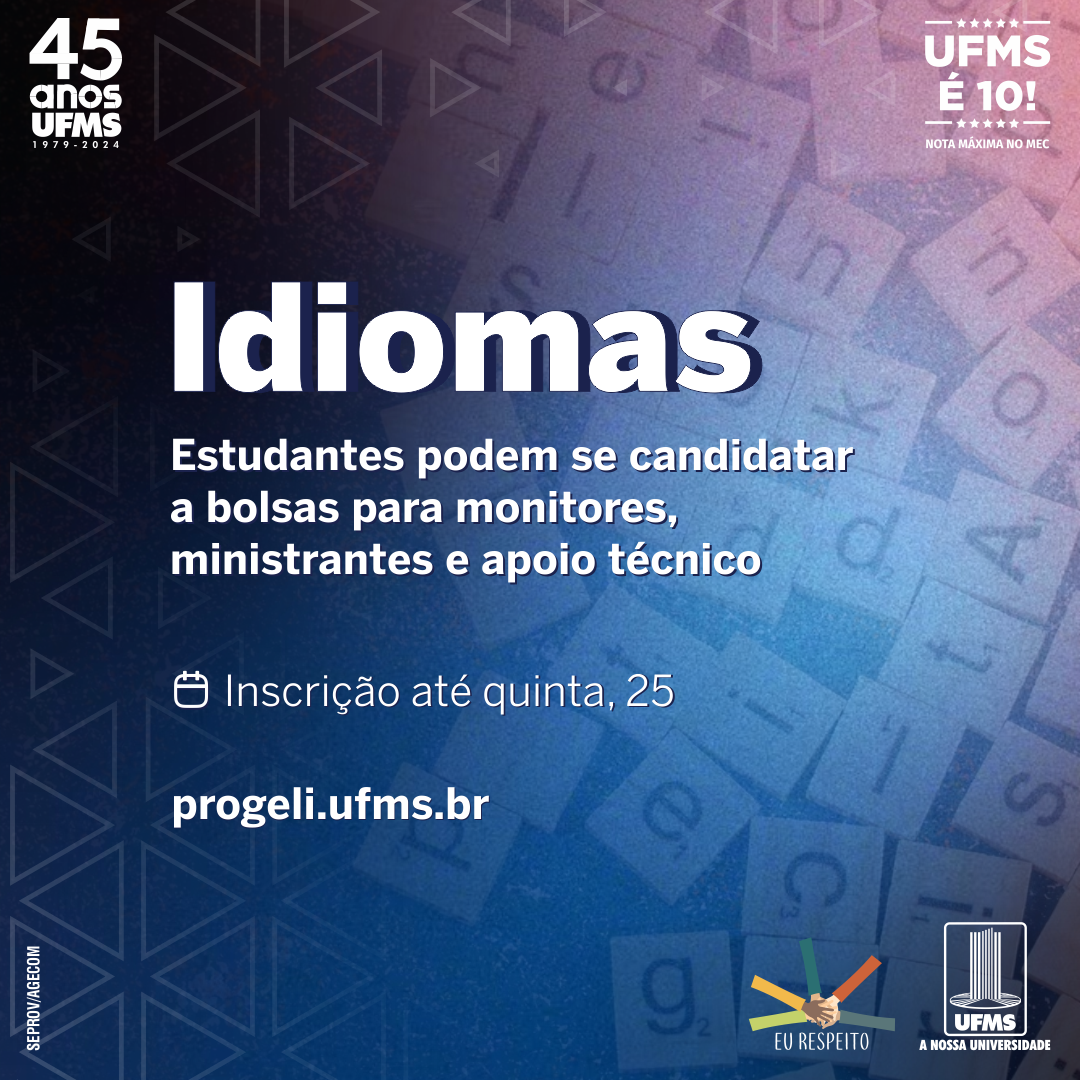 O Programa de Extensão de Ensino de Línguas (Progeli) vai selecionar 40 estudantes para atuarem como ministrantes, monitores, oficineiros e apoio administrativo. As inscrições estão abertas e seguem até o dia 25 de janeiro pelo formulário de inscrição.