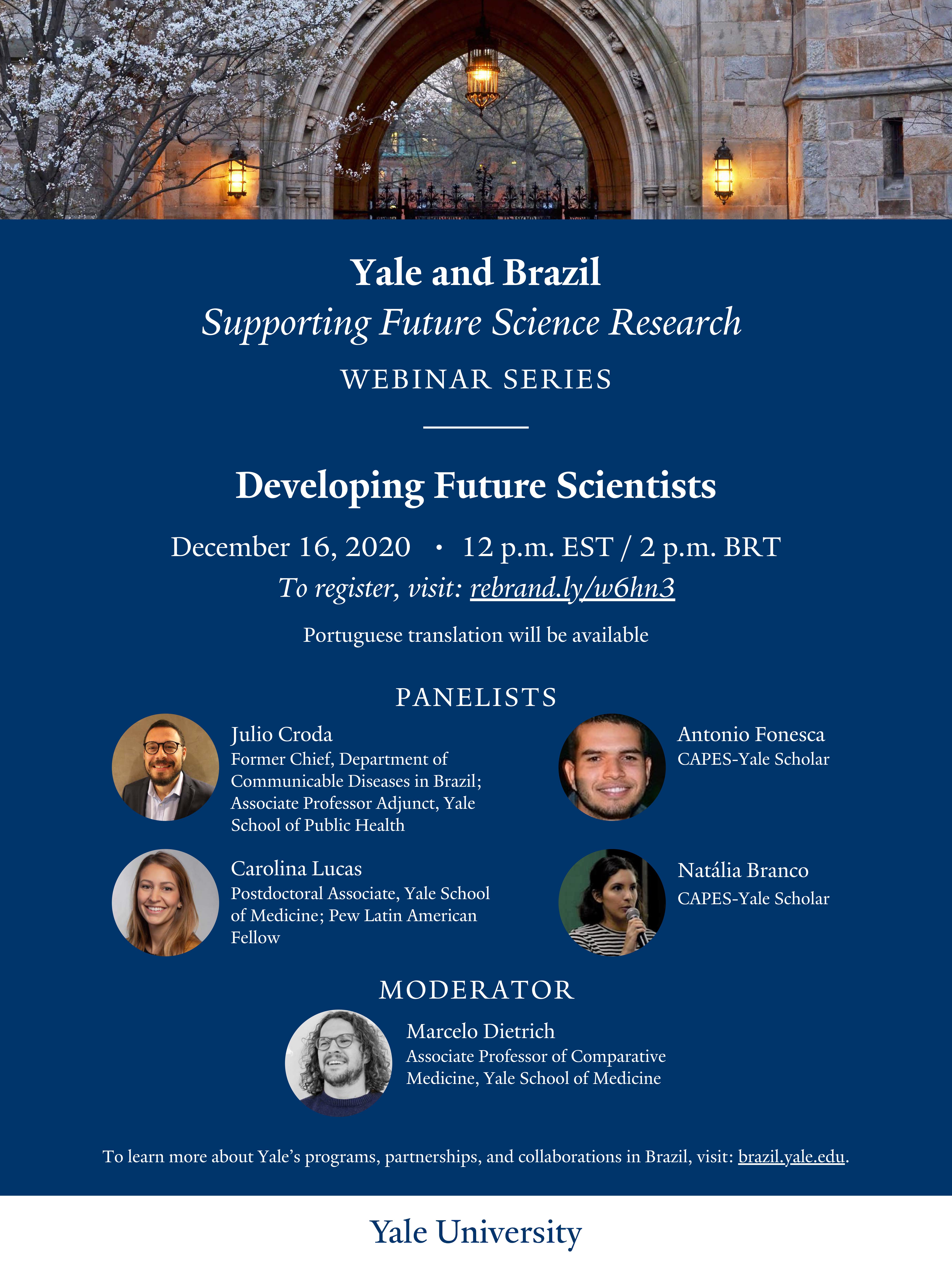 Amanhã, 16, a Universidade de Yale realiza o primeiro webinar da série Supporting Future Science Research (Apoiando o Futuro da Pesquisa Científica, em tradução livre), sob o tema Yale e Brasil: Desenvolvendo os Cientistas do Futuro. O evento é gratuito, às 14h do horário de Brasília, e destinado a estudantes e pesquisadores brasileiros interessados em seguir carreira na área científica.
